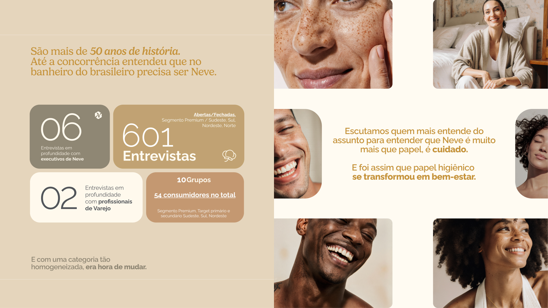Votar neste projetoHá mais de 50 anos, Neve lidera o mercado e definiu os códigos da categoria. Mas, em um cenário “neveficado”, onde os concorrentes passaram a repetir sua linguagem visual e verbal, a marca precisava se reinventar para seguir à frente. Fomos convidados a repensar seu posicionamento e identidade. Em uma imersão com consumidores, descobrimos que o banheiro mudou: as pessoas buscavam uma relação mais emocional com sua rotina e produtos. Neve não era vista apenas como higiene pessoal, mas como um gesto diário de autocuidado. Foi assim que a marca entrou em um novo território, transformando o papel higiênico em bem-estar e mostrando com quantas camadas de cuidado se constrói uma rotina.