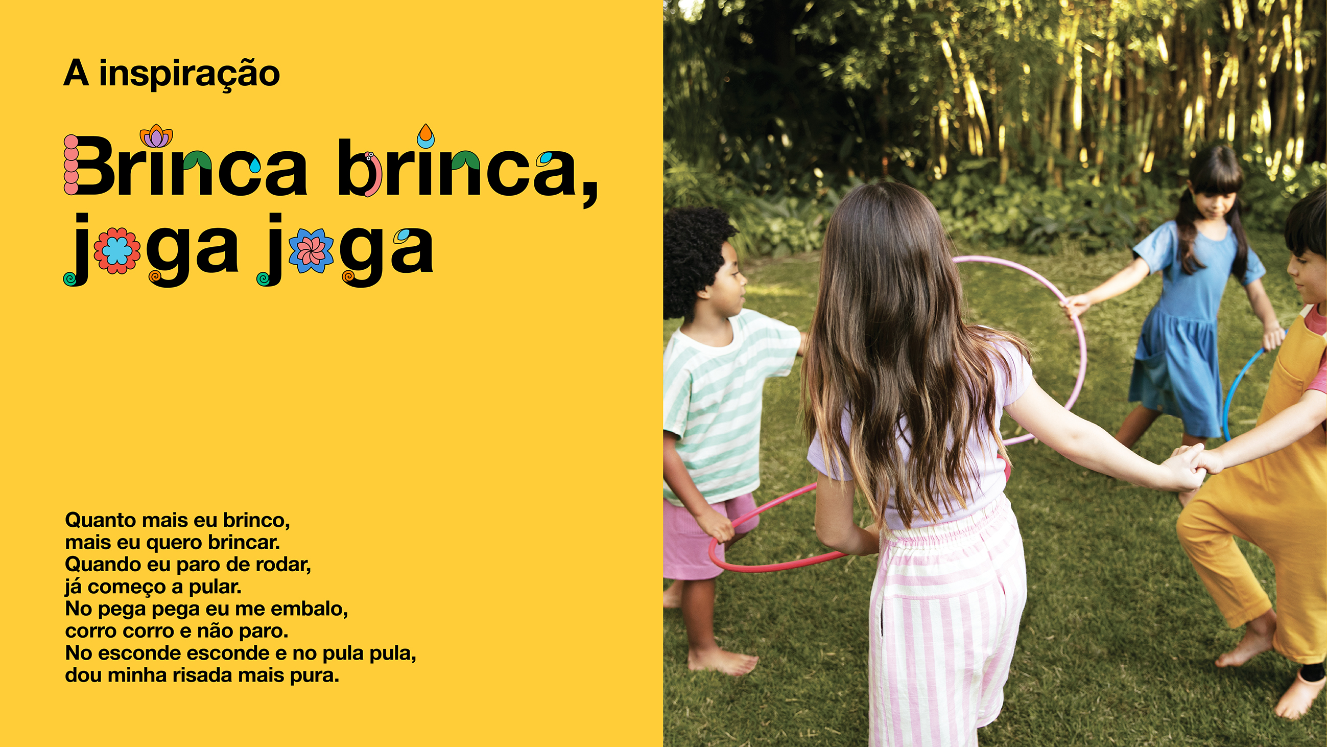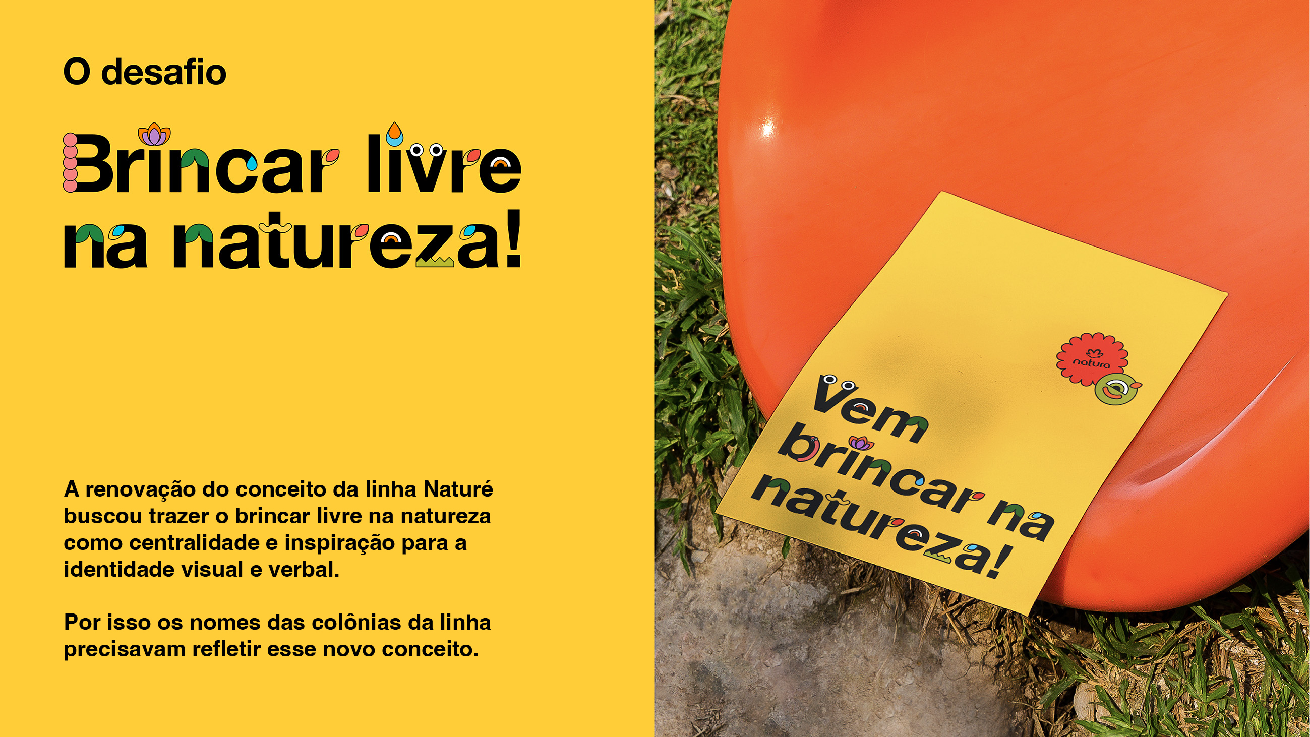 Votar neste projetoInspirados pelo conceito “Vem brincar na natureza!”, criamos os novos nomes das colônias da linha Natura Naturé. A ideia foi traduzir o brincar como experiência essencial para o desenvolvimento integral da criança, resgatando também a memória afetiva dos adultos. Assim, a natureza surge como cenário de brincadeiras livres e criativas, e os nomes evocam jogos populares da infância — Pula Pula, Corre Corre, Pula Corda, Esconde Esconde e Pique Pega. A originalidade está em transformar essas brincadeiras em identidade verbal, conectando ludicidade, musicalidade e afeto de forma simples e memorável.