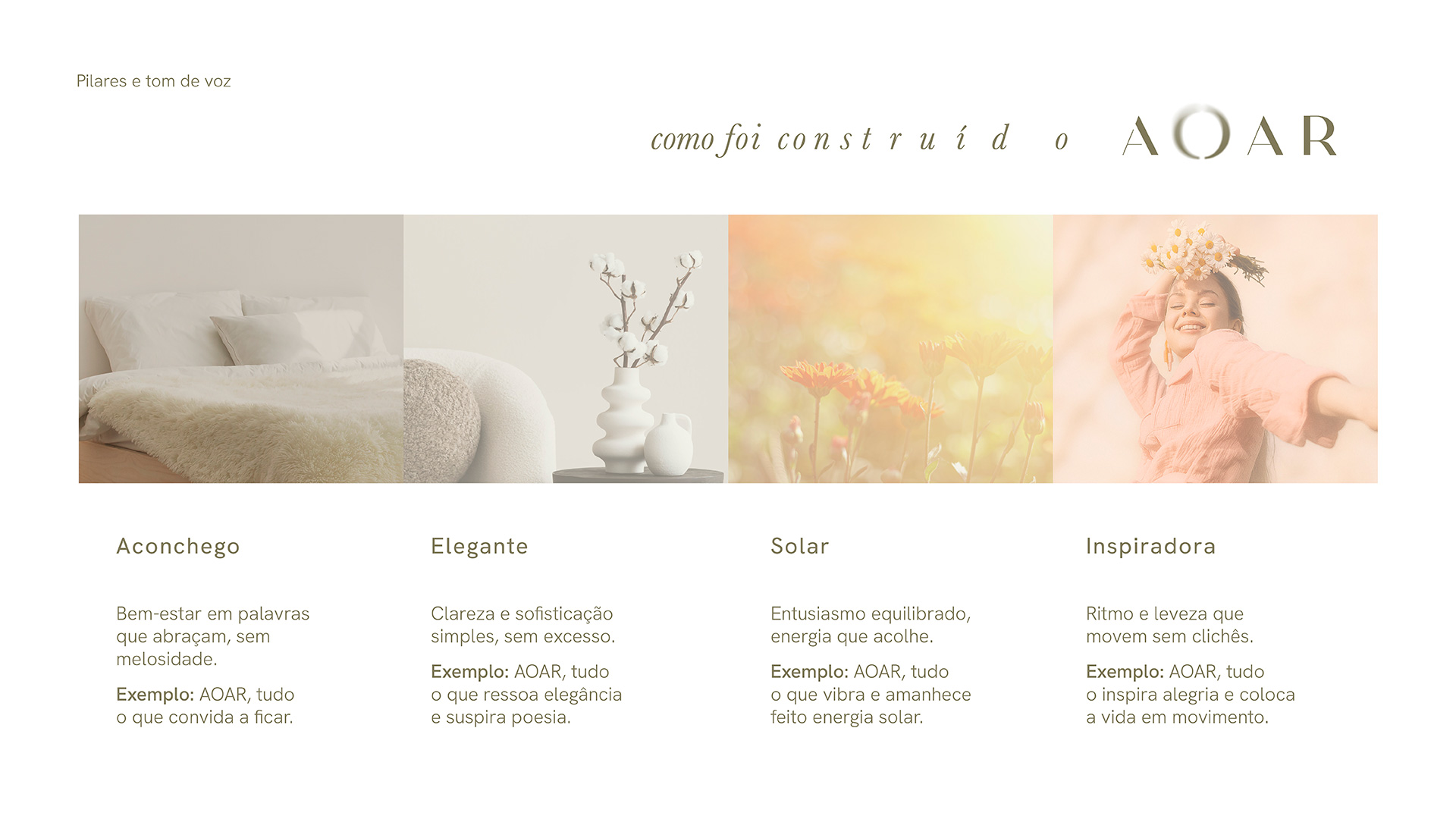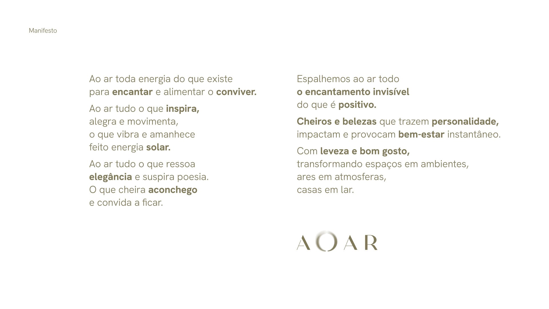 Votar neste projetoAoar é uma marca premium de aromatização de ambientes criada a partir de um processo completo de branding, do naming à comunicação. A identidade traduz a beleza do invisível com áreas de respiro, cores suaves e imagens difusas. Nas embalagens, relevos branco sobre branco e impressões internas em tons sutis reforçam delicadeza e surpresa cromática ao abrir. A comunicação adota frases que se desfazem ao ar, com espaçamento gradual das letras, e um tom de voz poético e sensível, projetado para despertar sentidos e bem-estar em cada ponto de contato.
