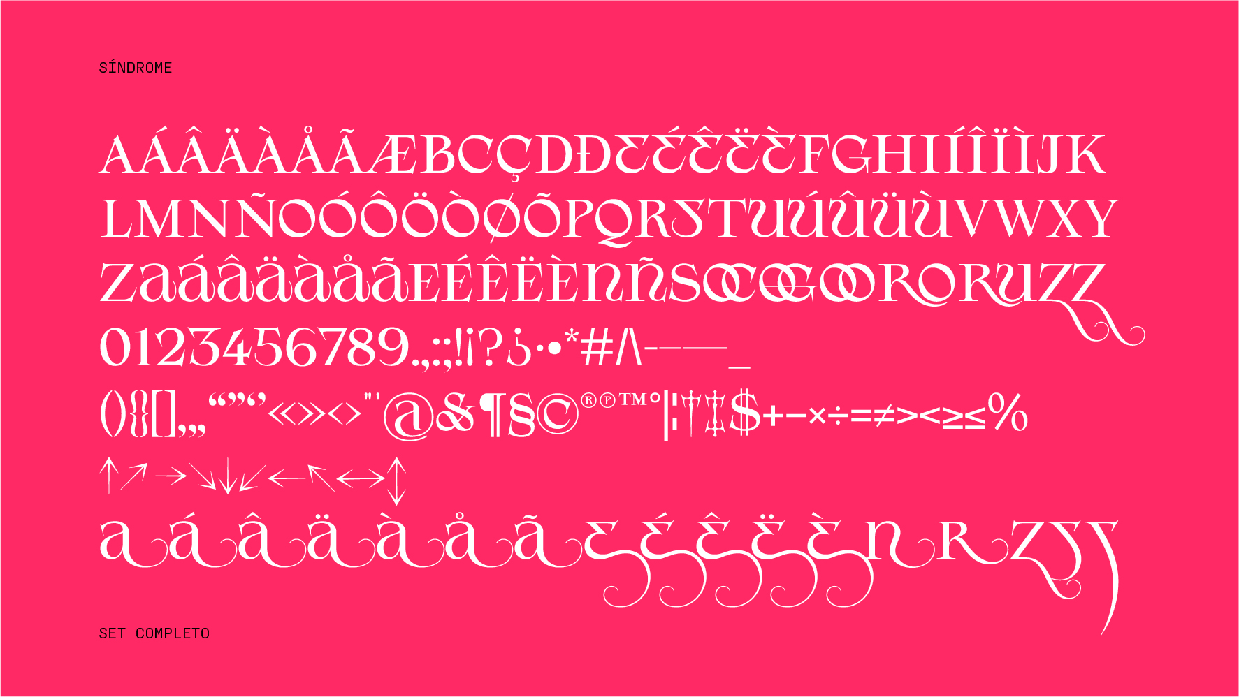 Votar neste projetoSíndrome é uma tipografia display unicase com serifas exageradas, alto contraste e caracteres inusitados que utiliza de recursos OpenType para dar mais opções e maior possibilidade de customização ao usuário. A vetorização com segmentos retos e desenhos atípicos para certos caracteres, como o “E” e o “S”, dão um caráter extremamente contemporâneo para o sistema.
