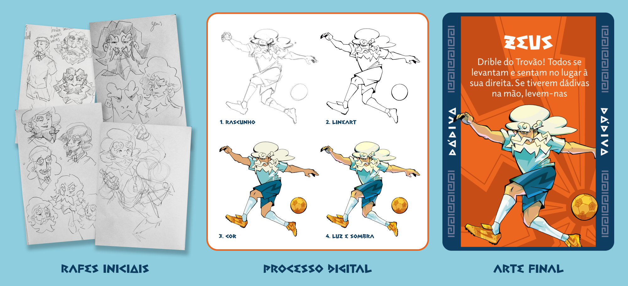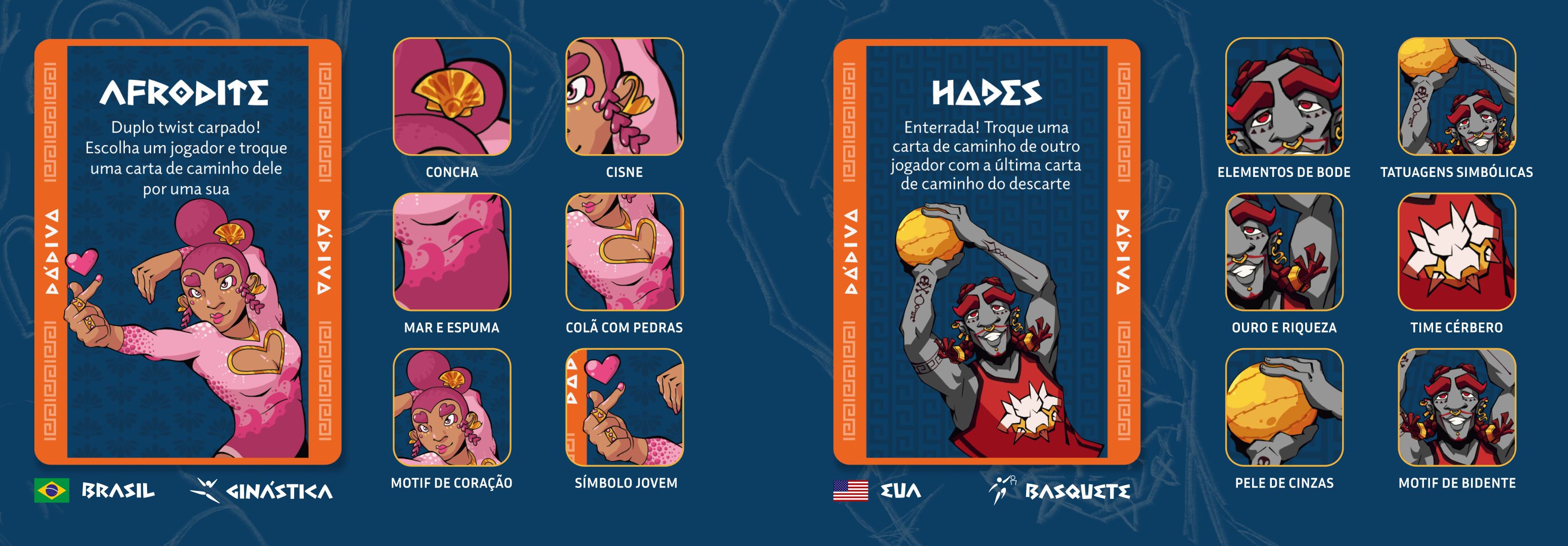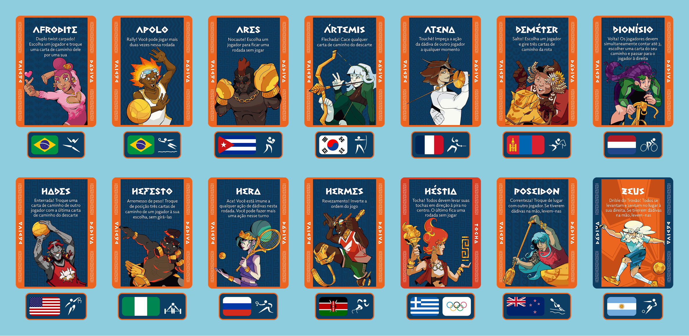 Votar neste projetoO projeto apresenta 14 deuses gregos ilustrados, reimaginados para o jogo de tabuleiro: “Caminhos a Olímpia”. A essência do trabalho reside na fusão inovadora de mitologia, esporte e diversidade global, com cada divindade representando um esporte olímpico ou paralímpico. Os fenótipos são variados, ligando cada deus a etnias e nacionalidades de destaque em suas modalidades. Por exemplo, a ilustração de Ártemis tem traços que remetem à fisionomia da Coreia do Sul, país medalhista em tiro com arco nos Jogos de 2024 - mas atira com os pés, inspirada em uma atleta paralímpica indiana - e incorpora o símbolo da lua em seu cabelo. O projeto também inclui grafismos inspirados em afrescos gregos para cada deus e ilustrações de fundo para outras cartas do jogo, como paisagens da Grécia antiga.