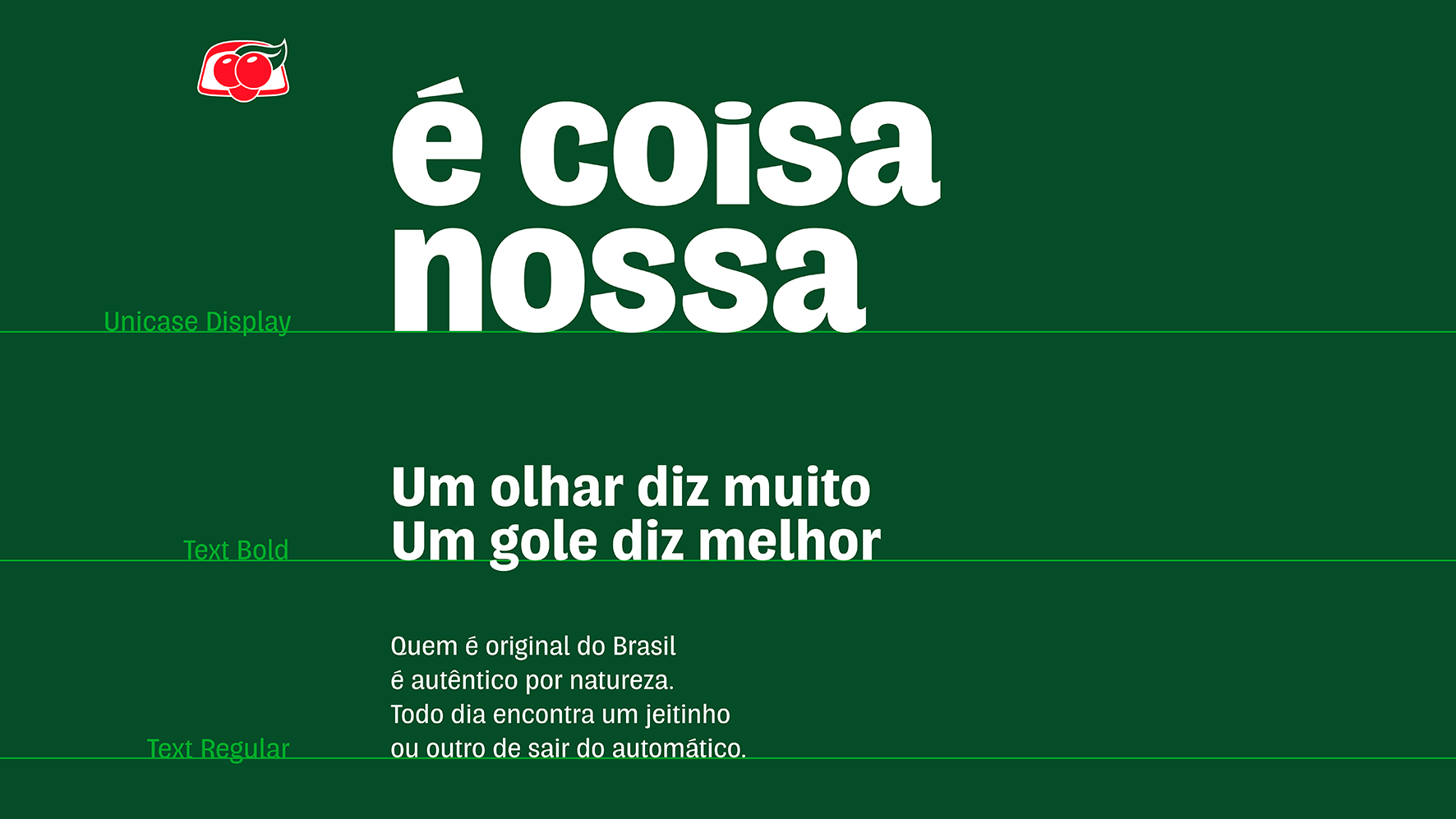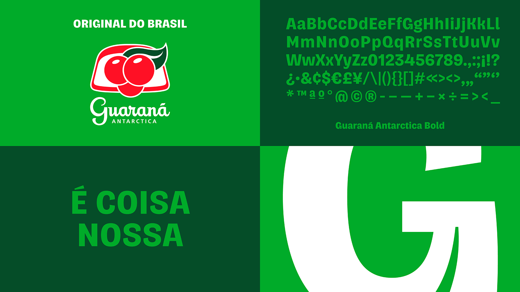 Votar neste projetoGuaraná Antarctica Typeface Uma família tipográfica exclusiva que reflete a essência do Guaraná Antarctica, expressando uma brasilidade não óbvia e irreverência por meio de uma unicase para títulos (display). A tipografia desempenha um papel importante como elemento identitário da marca, sendo aplicada em todos os pontos de contato. Para textos, foi desenvolvida uma tipografia variável (do Bold ao Regular), que também oferece caracteres alternativos para garantir composições únicas. A família inclui ainda uma tipografia colorida variável: um “guaranazinho” que, por meio de duas variáveis, muda de posição, abre e fecha os olhos, podendo ser usado como padrão gráfico ou combinado a textos. Uma tipografia original do Brasil e exclusiva para o Guaraná Antarctica.