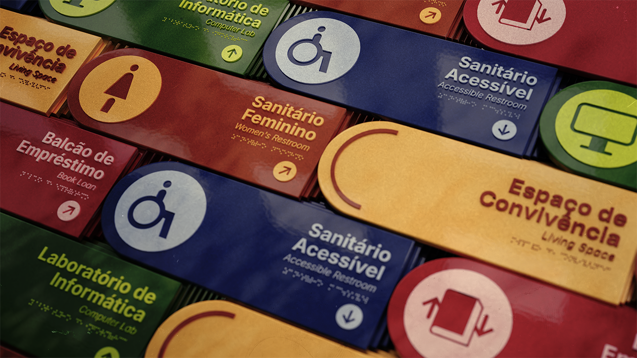 Votar neste projetoO projeto criou um sistema de sinalização unificado para a Biblioteca de Saúde da UFBA, resolvendo o desafio de orientar um público diverso em quatro andares e múltiplos setores. A solução priorizou clareza visual, acessibilidade e durabilidade, com uso de acrílico em alto-relevo e adesivos de alta resistência. Respeitando a codificação por cores já existente e aplicando alto contraste para legibilidade, foram desenvolvidos modelos específicos para acervos, sanitários e emergências, com ícones intuitivos e textos bilíngues. O resultado é um sistema funcional e integrado à identidade institucional, qualificando a experiência dos usuários.