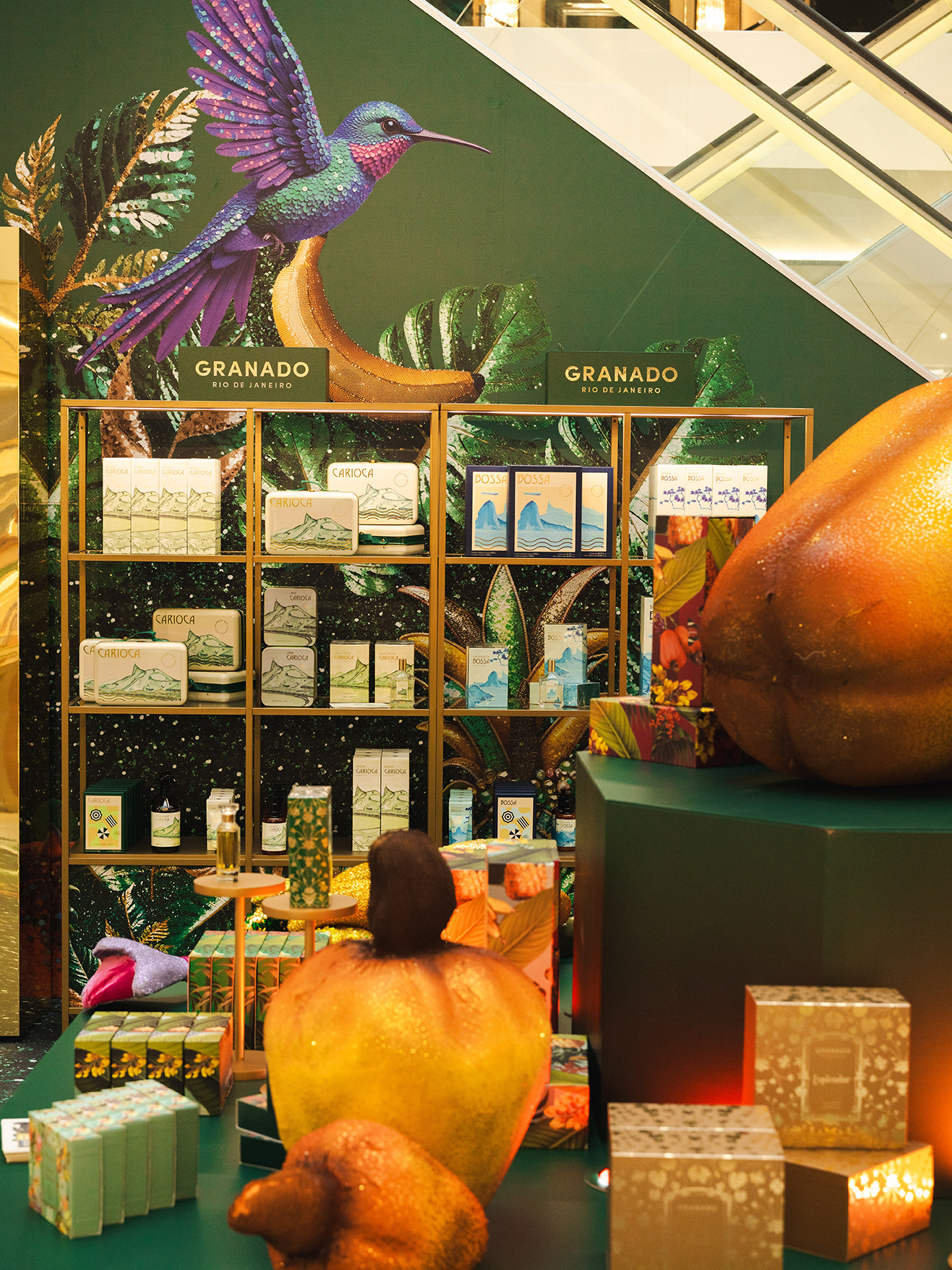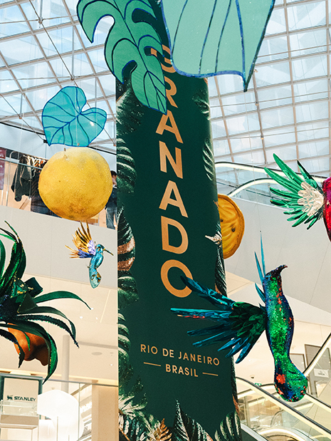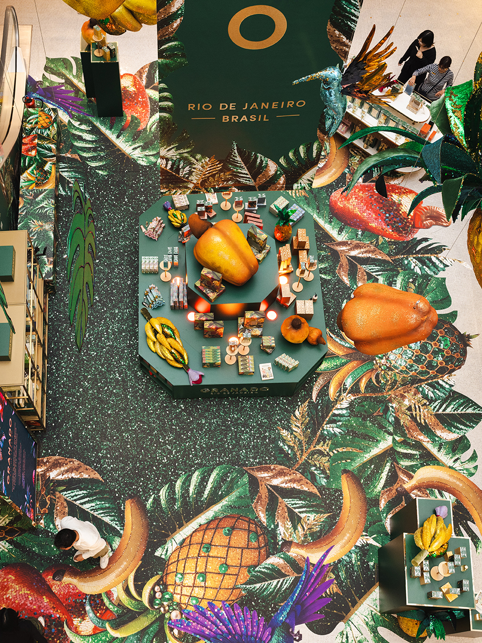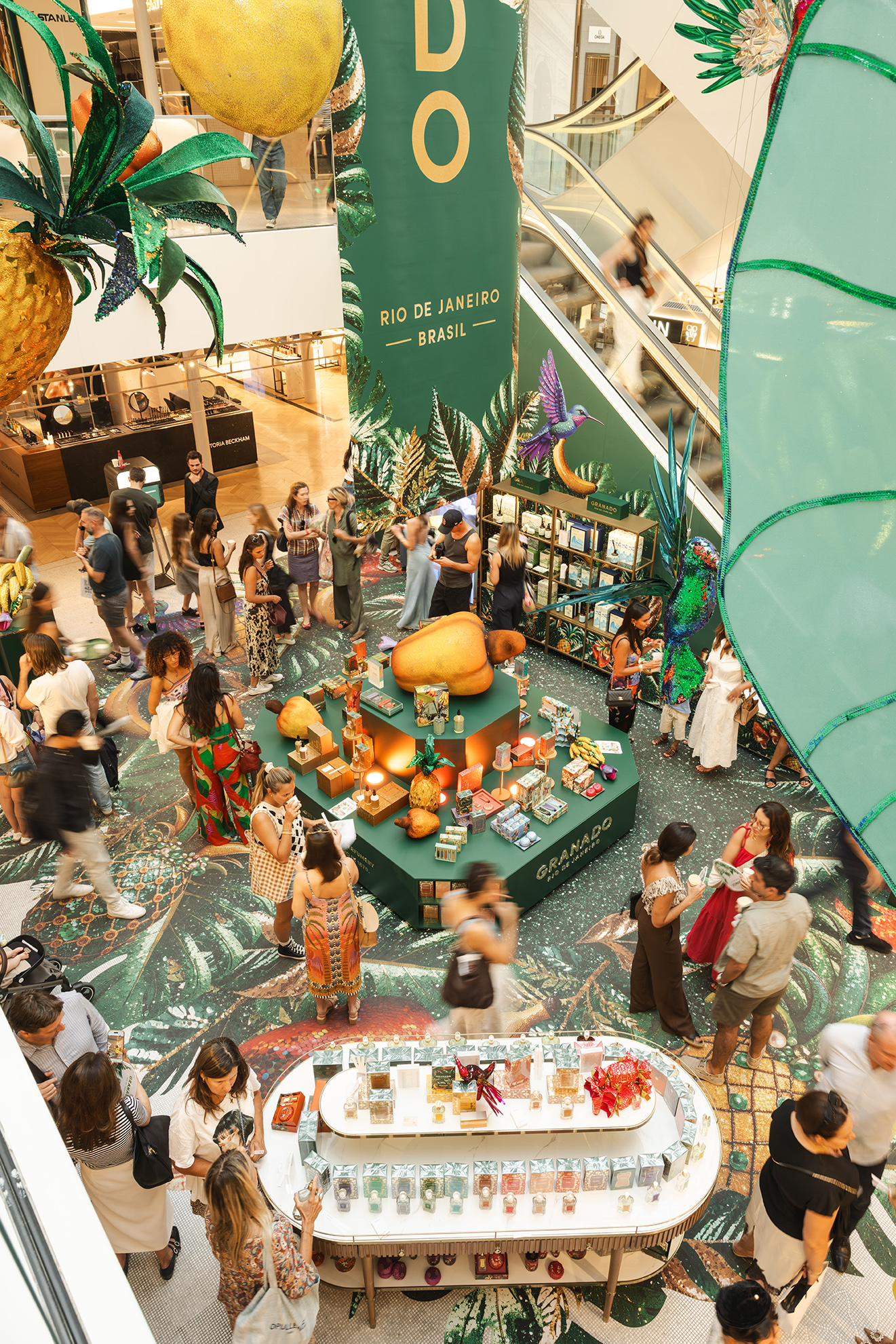 Votar neste projetoFoi colocada, no átrio da loja de departamentos La Samaritaine, em Paris, uma instalação inspirada no Carnaval Tropical do Brasil. O espaço recebeu estantes douradas, totens laterais e uma mesa poligonal contendo as fragrâncias mais representativas da marca. Além de o ponto de venda estar em um local com grande impacto visual, os elementos cenográficos utilizados denotam as raízes brasileiras representadas pela sua flora e fauna, que fazem parte do ideário artístico da marca. O chão também é adesivado com a mesma identidade do Carnaval Tropical e o teto de vidro atrai os raios solares, que valorizam o brilho das peças penduradas no átrio. Esta unicidade visual interage com a arquitetura da La Samaritaine, que reúne art nouveau e art decó, criando uma atmosfera única e suntuosa.