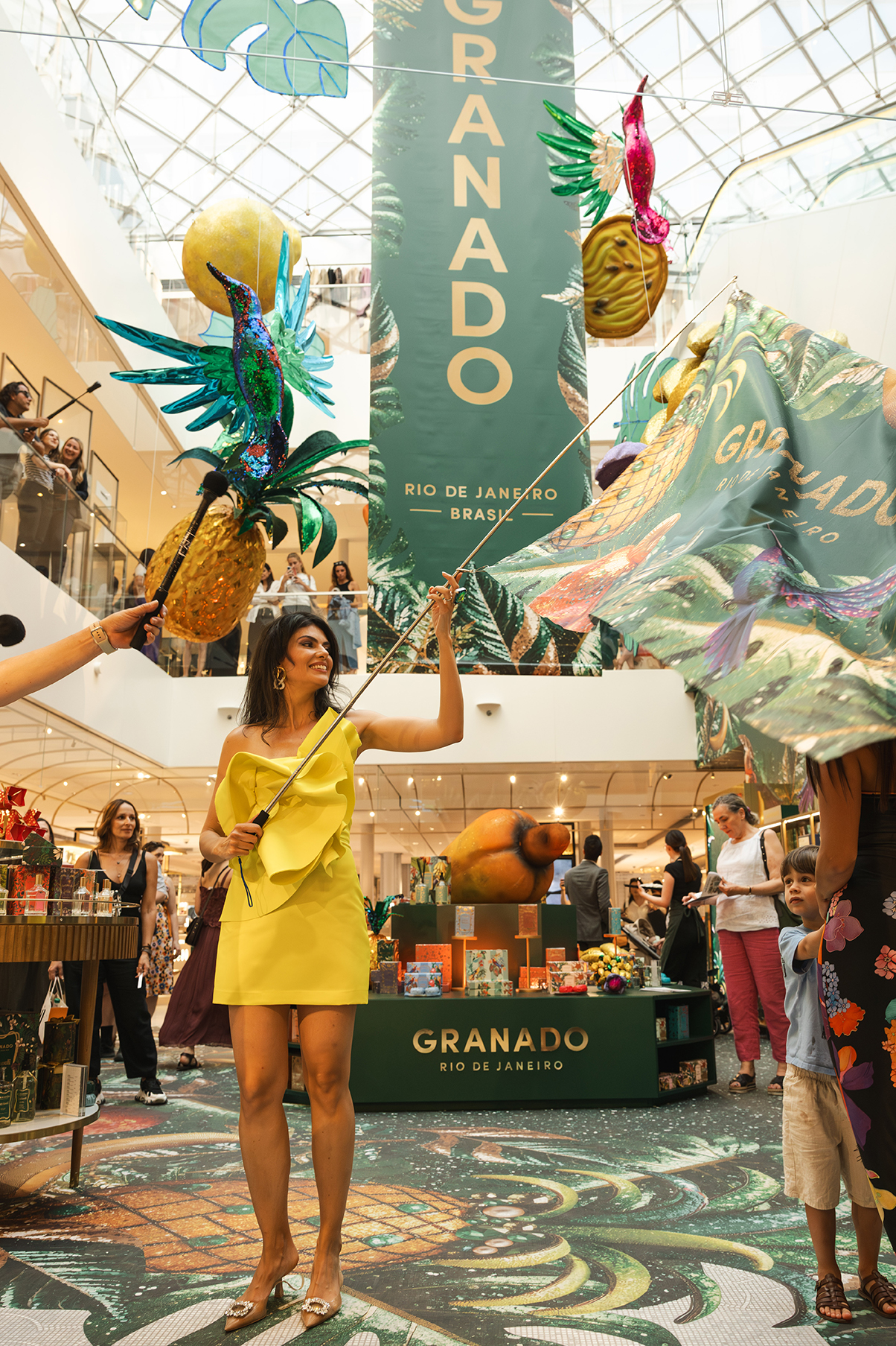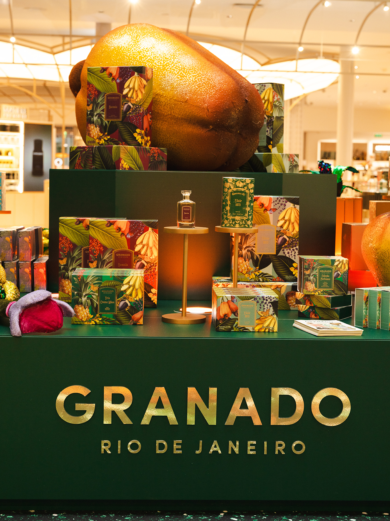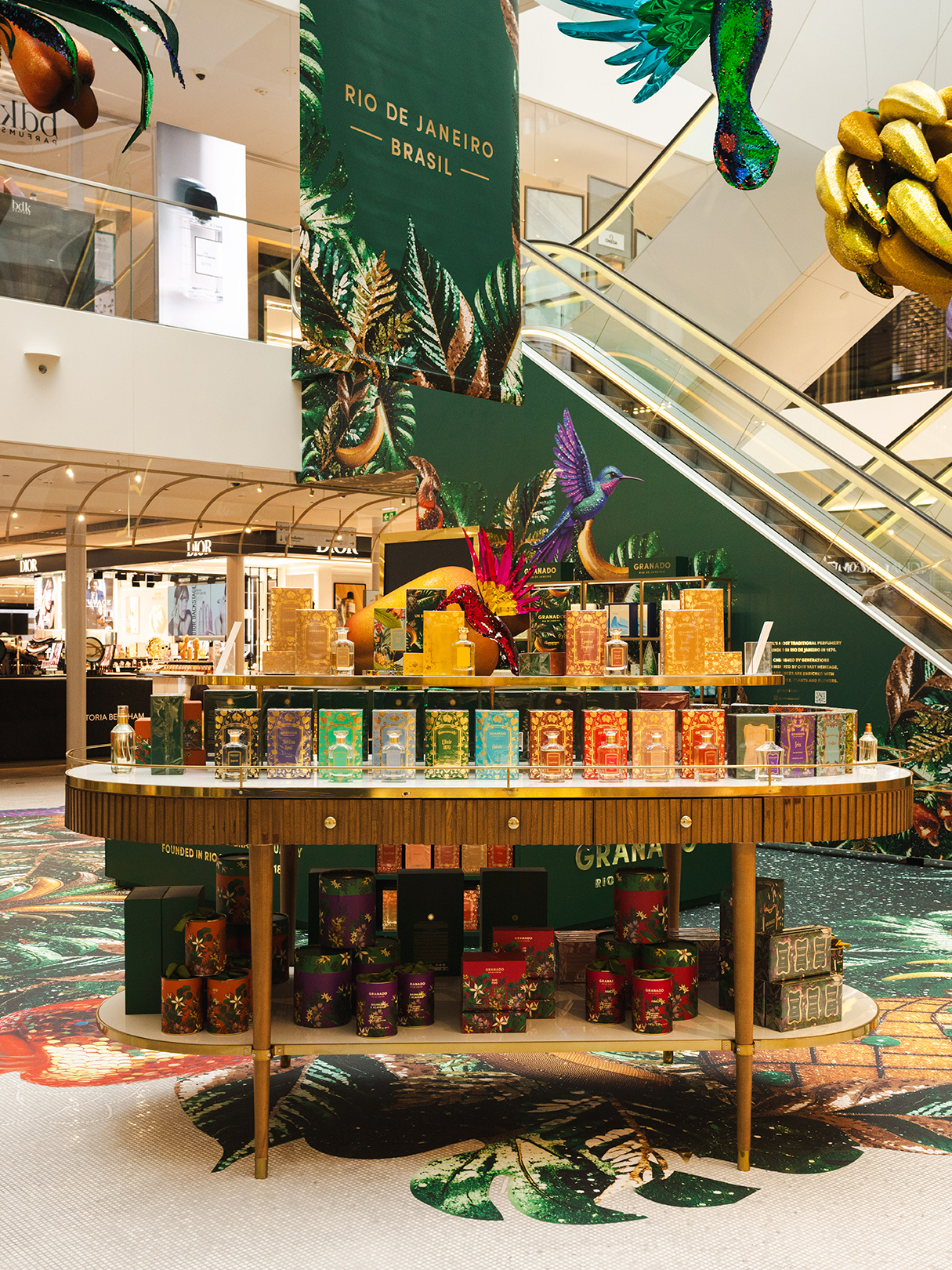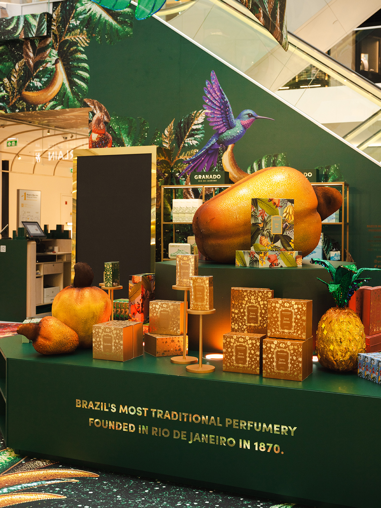 Votar neste projetoFoi colocada, no átrio da loja de departamentos La Samaritaine, em Paris, uma instalação inspirada no Carnaval Tropical do Brasil. O espaço recebeu estantes douradas, totens laterais e uma mesa poligonal contendo as fragrâncias mais representativas da marca. Além de o ponto de venda estar em um local com grande impacto visual, os elementos cenográficos utilizados denotam as raízes brasileiras representadas pela sua flora e fauna, que fazem parte do ideário artístico da marca. O chão também é adesivado com a mesma identidade do Carnaval Tropical e o teto de vidro atrai os raios solares, que valorizam o brilho das peças penduradas no átrio. Esta unicidade visual interage com a arquitetura da La Samaritaine, que reúne art nouveau e art decó, criando uma atmosfera única e suntuosa.