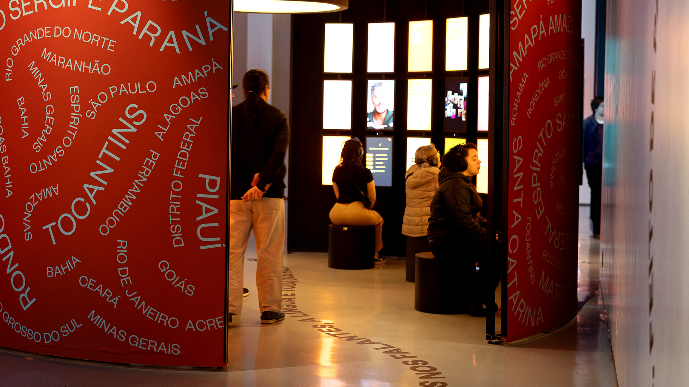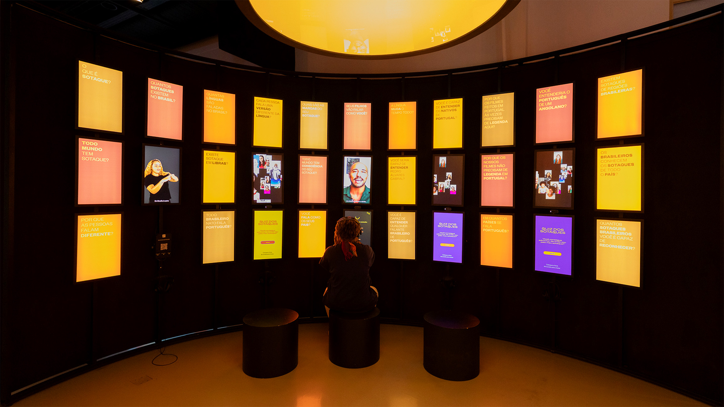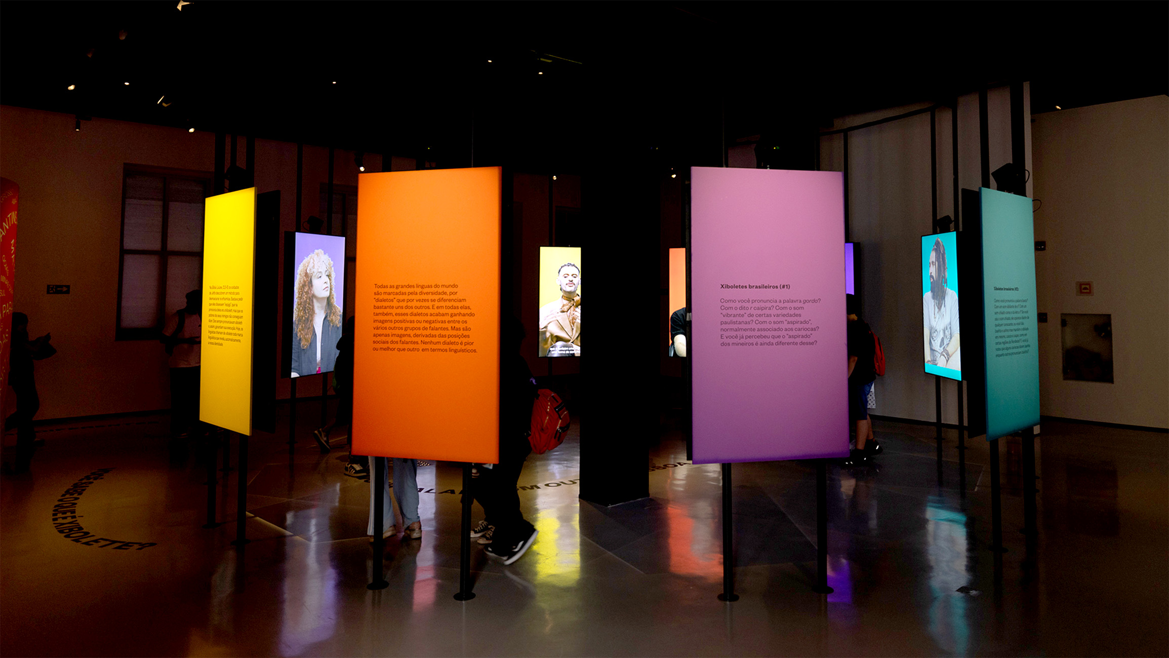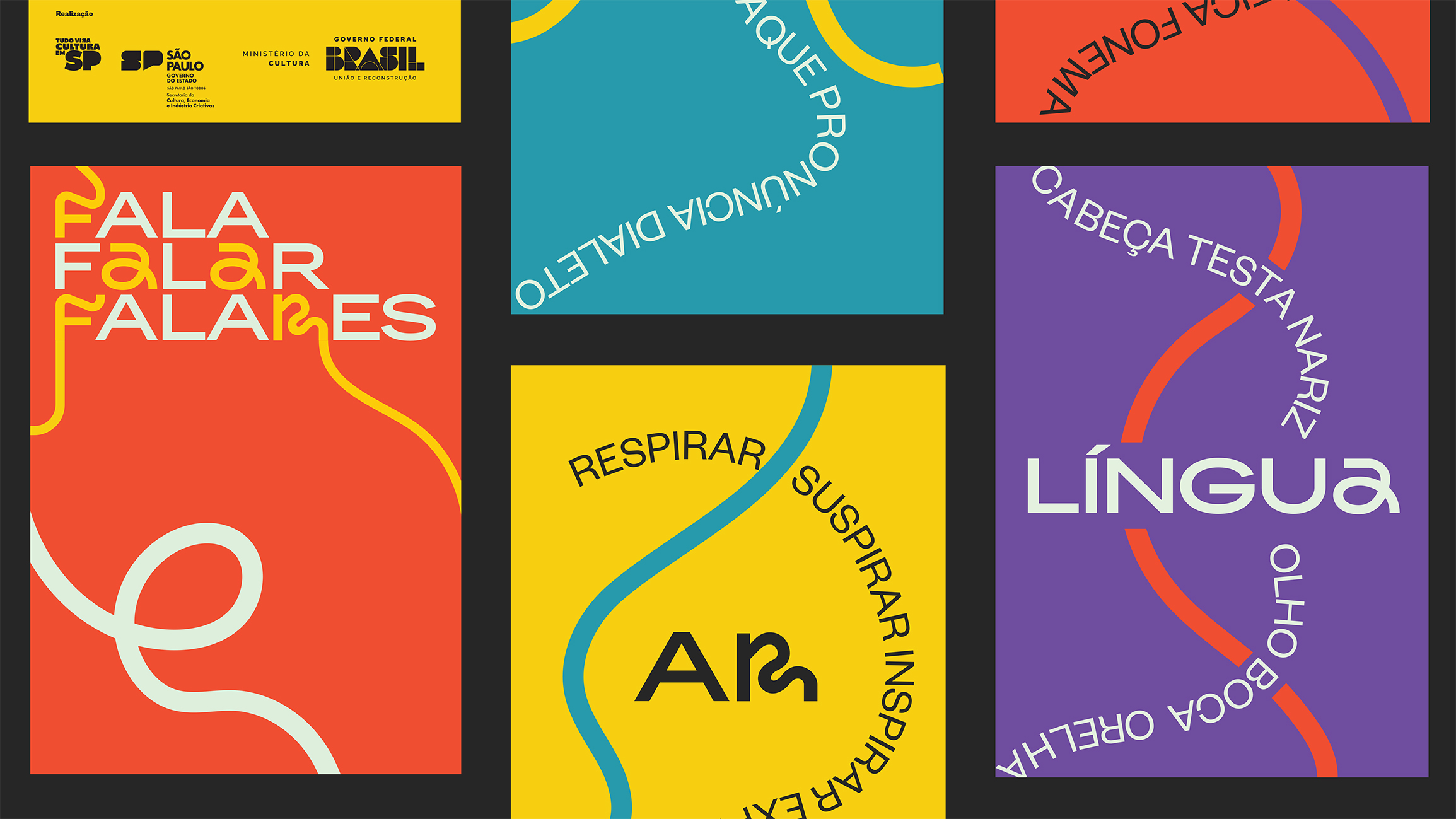 Votar neste projeto"Fala Falar Falares" é uma exposição temporária do Museu da Língua Portuguesa que convida o público a refletir sobre a fala como superpoder da espécie humana. Da fisiologia da voz à diversidade dos sotaques, a mostra combina ciência, arte e linguagem para revelar, de forma imersiva, o que torna único o português falado no Brasil. Criamos a identidade visual da exposição e sua aplicação no espaço, com uma linguagem gráfica que reverbera a oralidade em forma, cor e movimento. A tipografia é fluida, vibrante e ocupa o espaço como a própria fala. O resultado é uma experiência visual integrada e viva, onde o design amplia a potência sensorial e afetiva da curadoria.