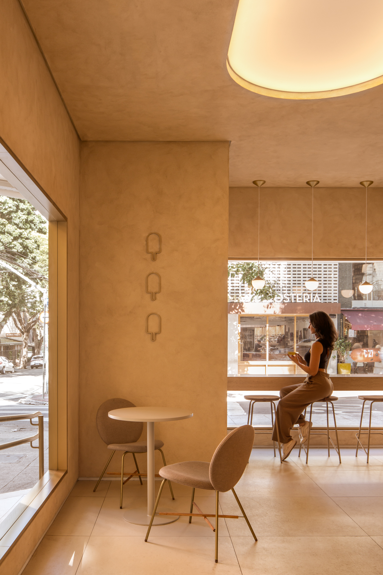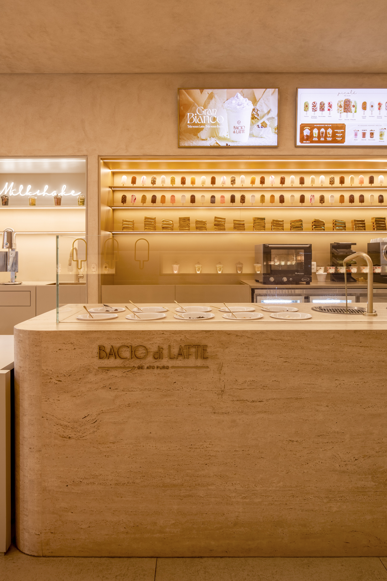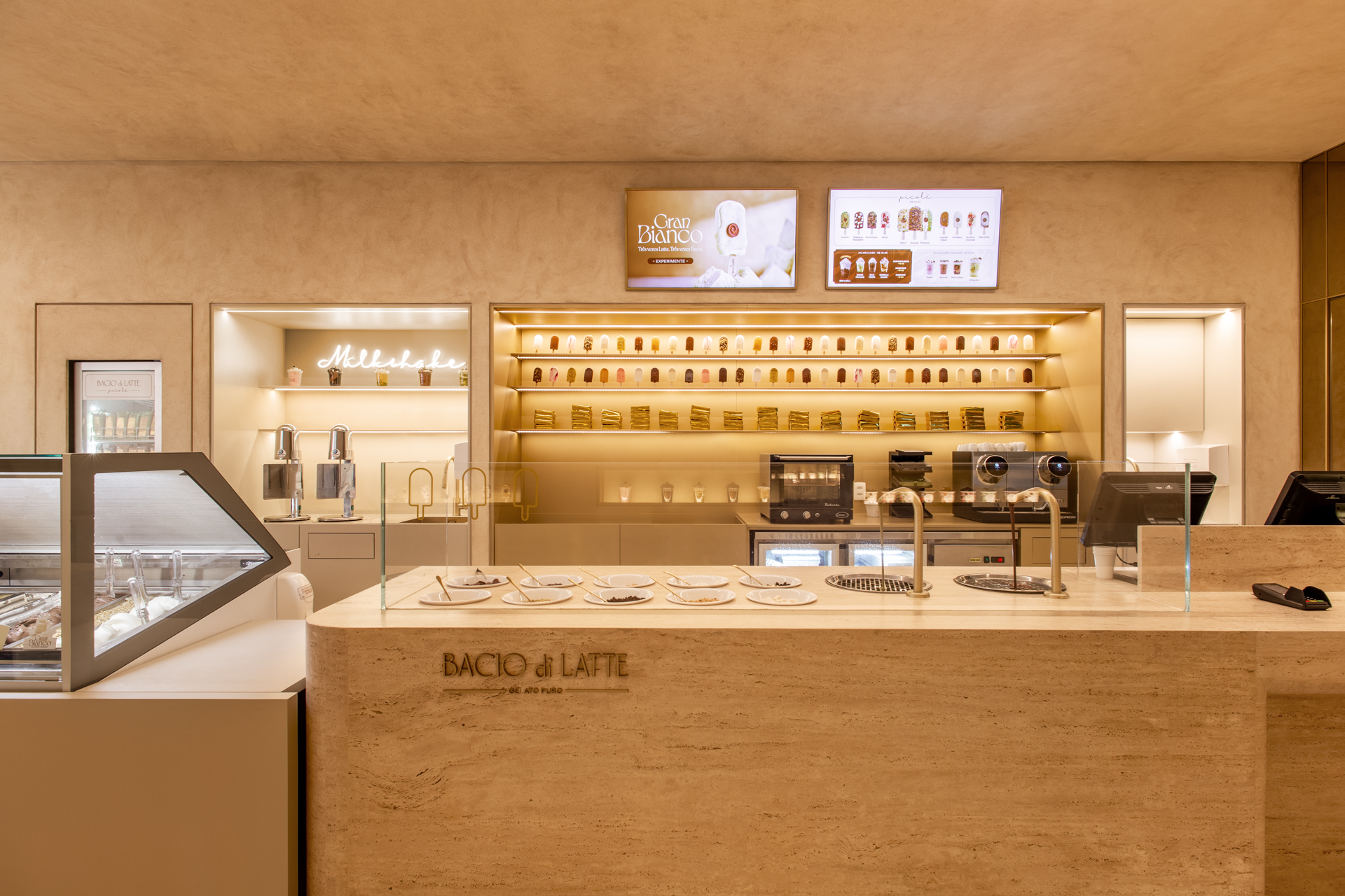Votar neste projetoCom inspiração na cremosidade dos sorvetes, o novo conceito para a primeira loja de picolés insanos da Bacio di Latte traz a ambientação monocromática e a sofisticação atemporal como bases de projeto. A fachada é pura, branca como o leite, com o elemento vertical em metal dourado. Tão italiano como os gelatos, o Travertino é protagonista. A bancada acessível, arredondada e solta no ambiente, tem a vitrine de picolés como jóias irresistíveis. A proposta destaca a pureza dos materiais e a composição mínima dos elementos, que, com a suavidade necessária, dão suporte à explosão de cores e sabores dos picolés.