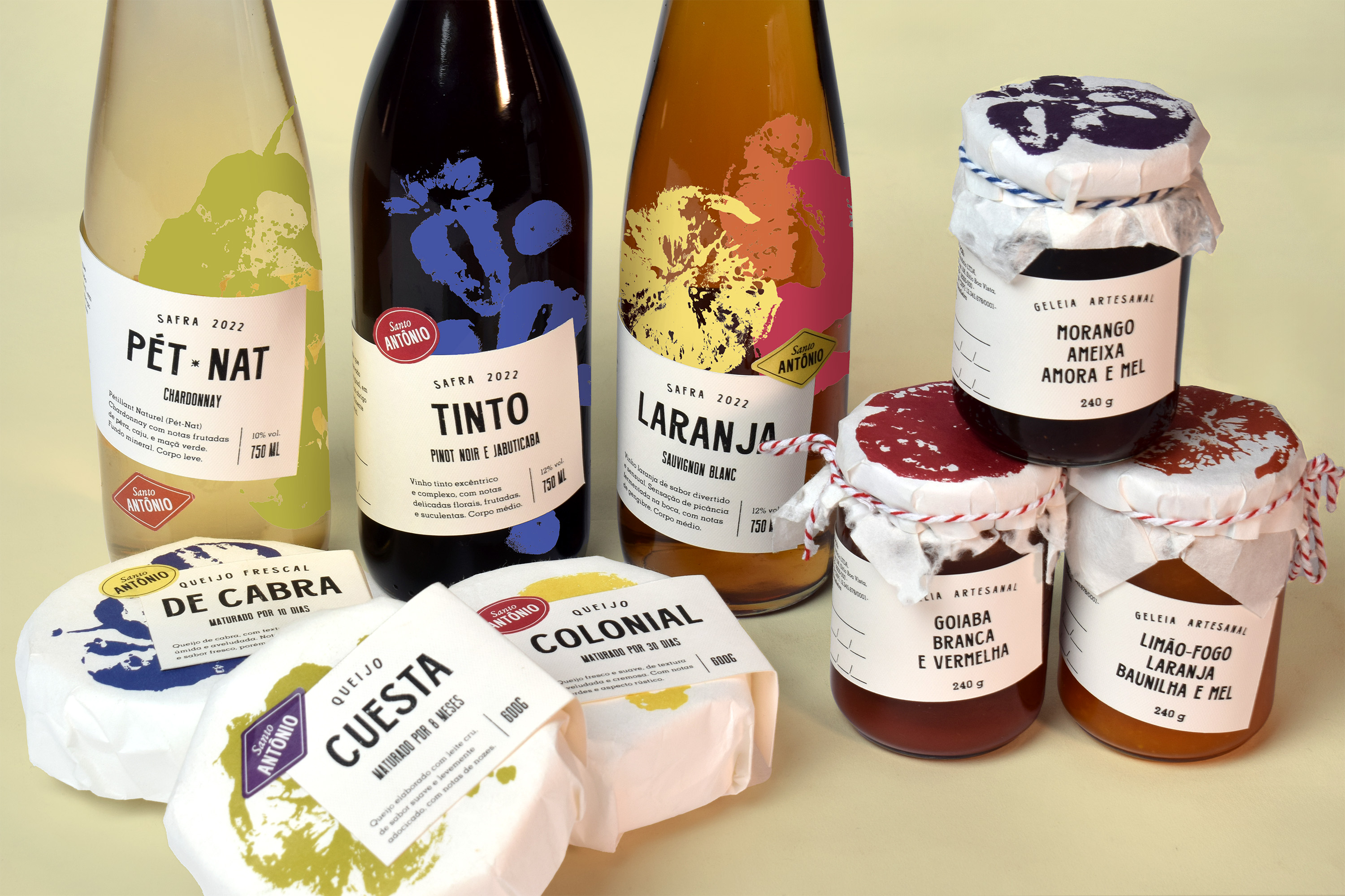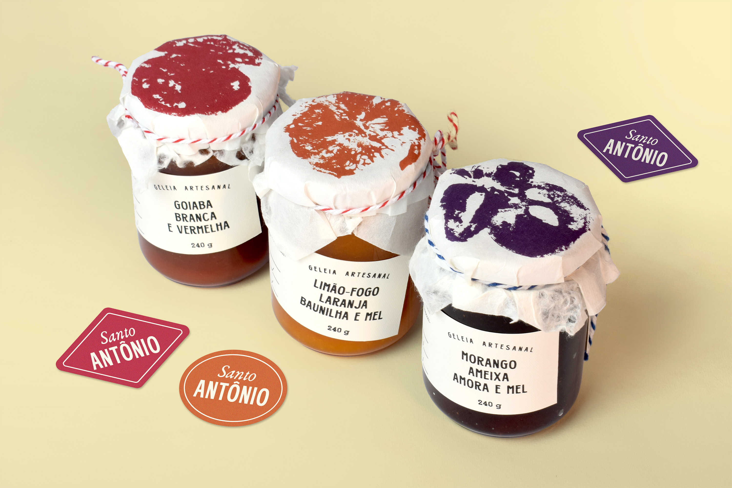 Votar neste projetoForam desenvolvidas embalagens e identidade visual para Santo Antônio, serviço de assinatura de produtos artesanais elaborados por microprodutores de Itapetininga-SP. A linha inclui rótulos para vinhos, geleias e queijos, criados para traduzir a autenticidade da produção local. No catálogo da marca, cada produto é único e varia conforme a sazonalidade, com embalagens que apresentam não apenas o conteúdo e o sabor, mas também sua origem e respectivo produtor. A fim de reforçar o caráter manual da marca, seus elementos gráficos incluem carimbos produzidos a partir de experimentação com ingredientes locais e layouts tipográficos desenvolvidos a partir do acervo de tipos móveis da FAU-USP, aproximando o consumidor urbano à atmosfera da fazenda.