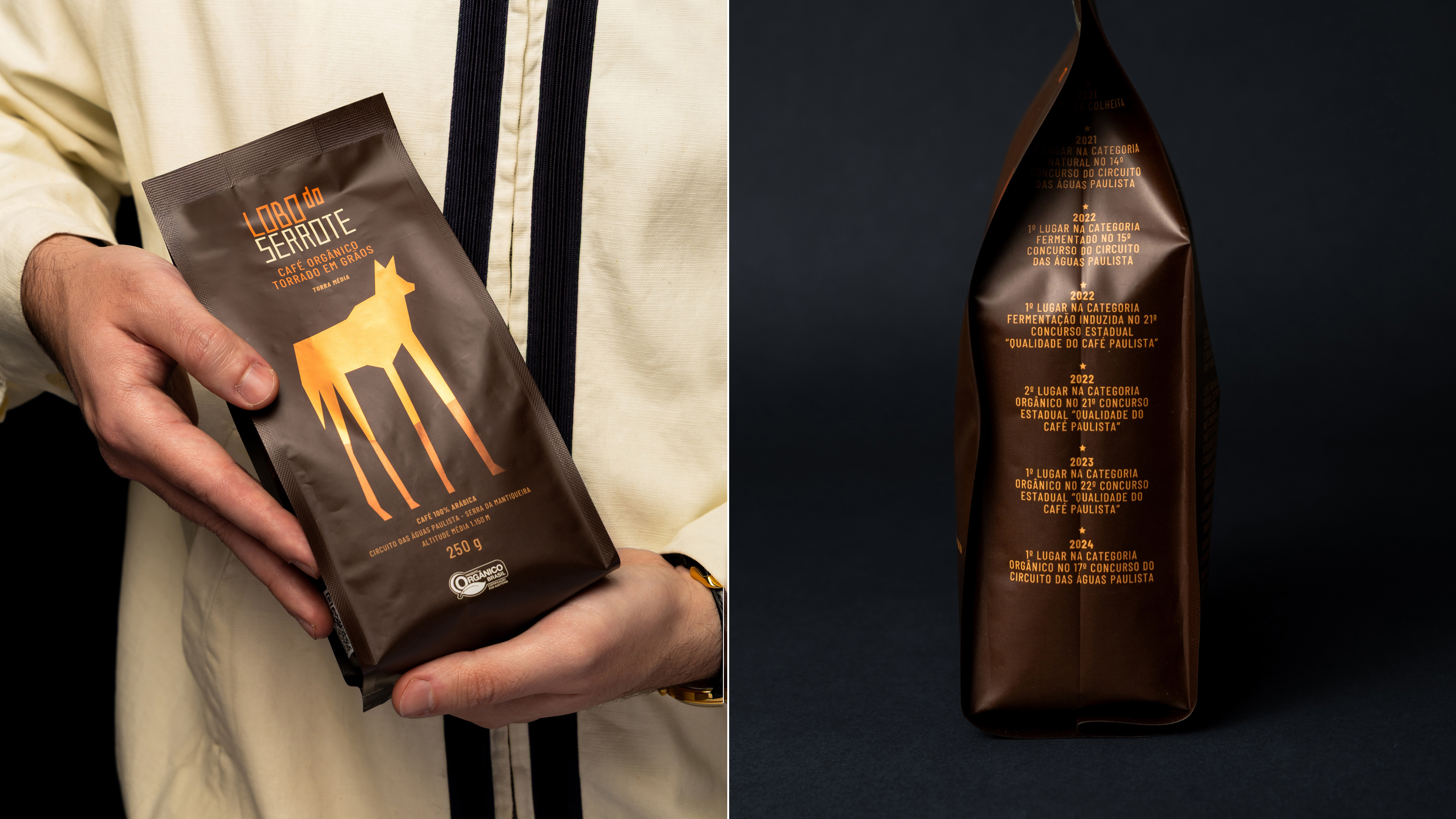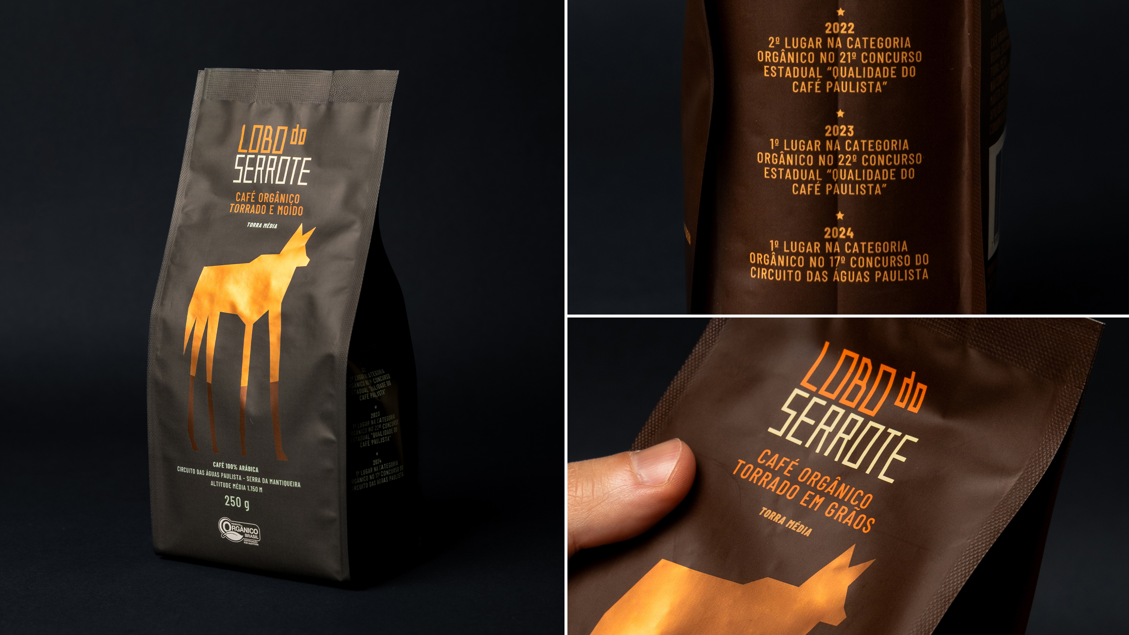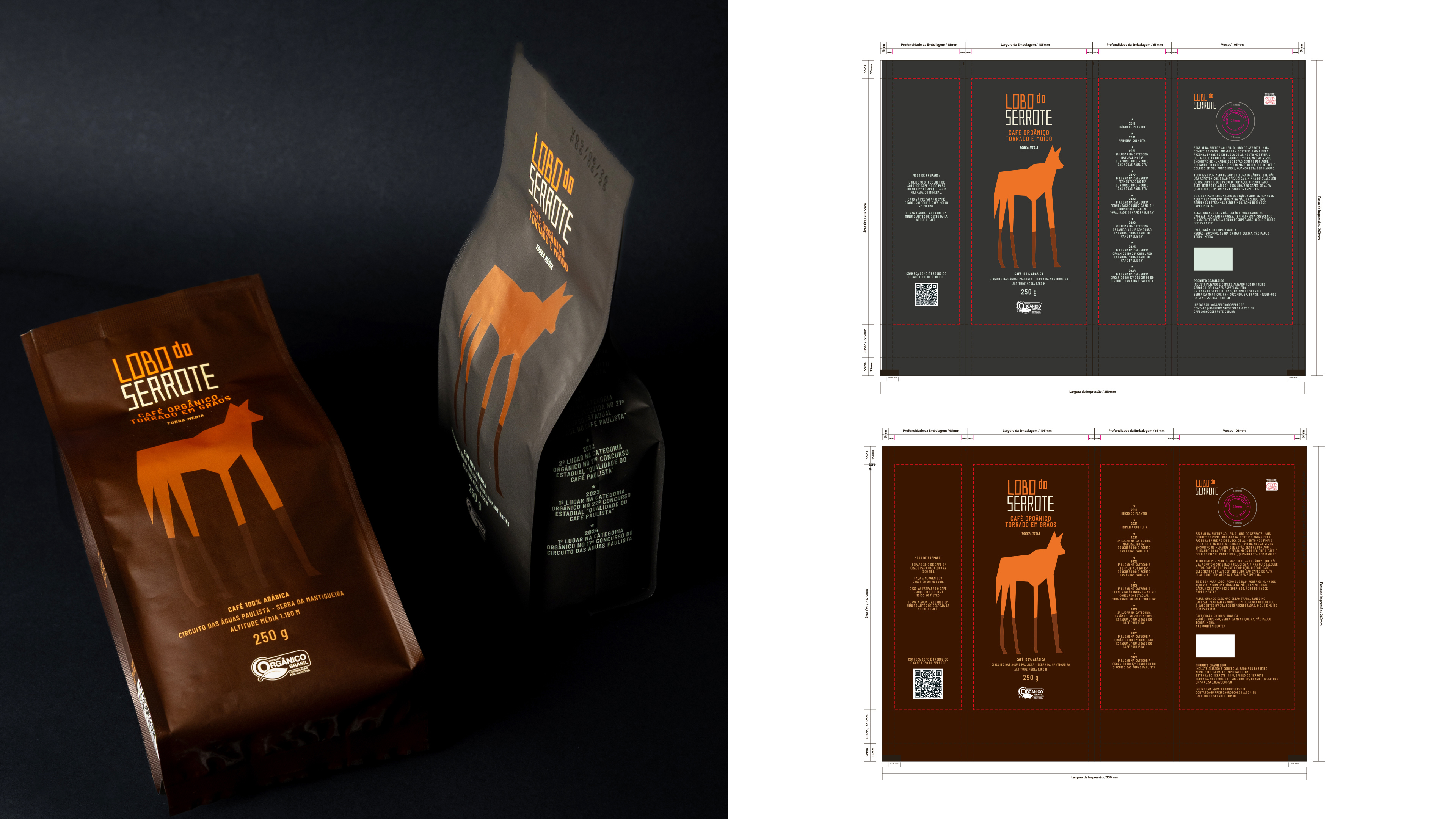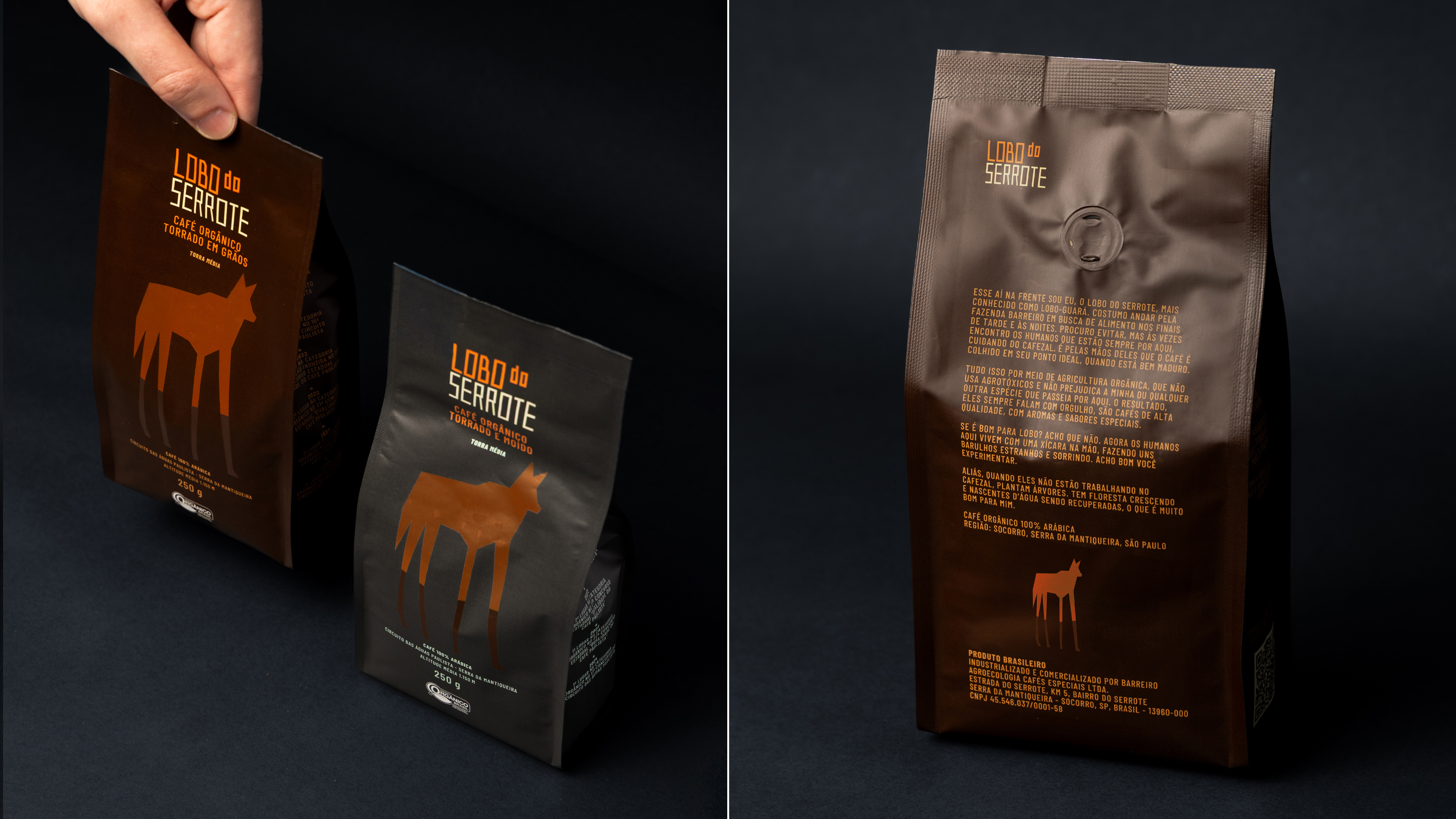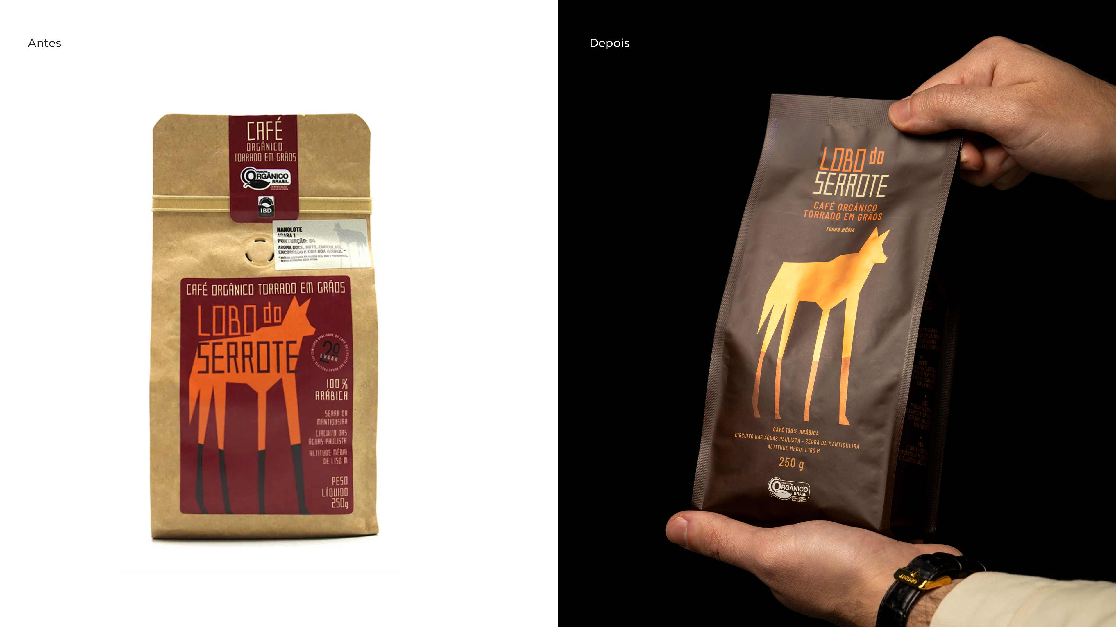 Votar neste projetoLobo do Serrote é um café orgânico premiado internacionalmente, reconhecido pela qualidade de suas safras e pelo compromisso com sustentabilidade e responsabilidade social. A nova embalagem traduz esses valores em um design minimalista e elegante, destacando o lobo-guará como protagonista absoluto, sem interferência, reforçando a personalidade única da marca e sua história envolvente.