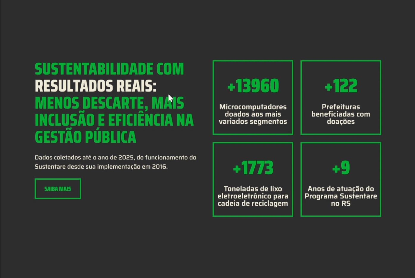 Votar neste projetoSe tudo o que fazemos no mundo físico gera impacto ambiental, por que não contamos o nosso impacto no ambiente digital? O redesign do site do Programa Sustentare evidencia o fato de que cada clique na internet também tem um peso para o meio ambiente. A nova homepage reduziu em 97% a emissão de CO₂ por acesso, caindo de 0,94g para 0,025g - o que significa que a cada mil visitas, quase 1 kg de CO₂ deixa de ser emitido, equivalente a 6 km não rodados de carro. Ao unir o compromisso já existente do Sustentare de destinação de lixo eletrônico, com práticas de sustentabilidade digital, o projeto inova ao tornar a navegação mais leve, transparente e consciente, adicionando a experiência online como parte da solução ambiental defendida pelo programa.