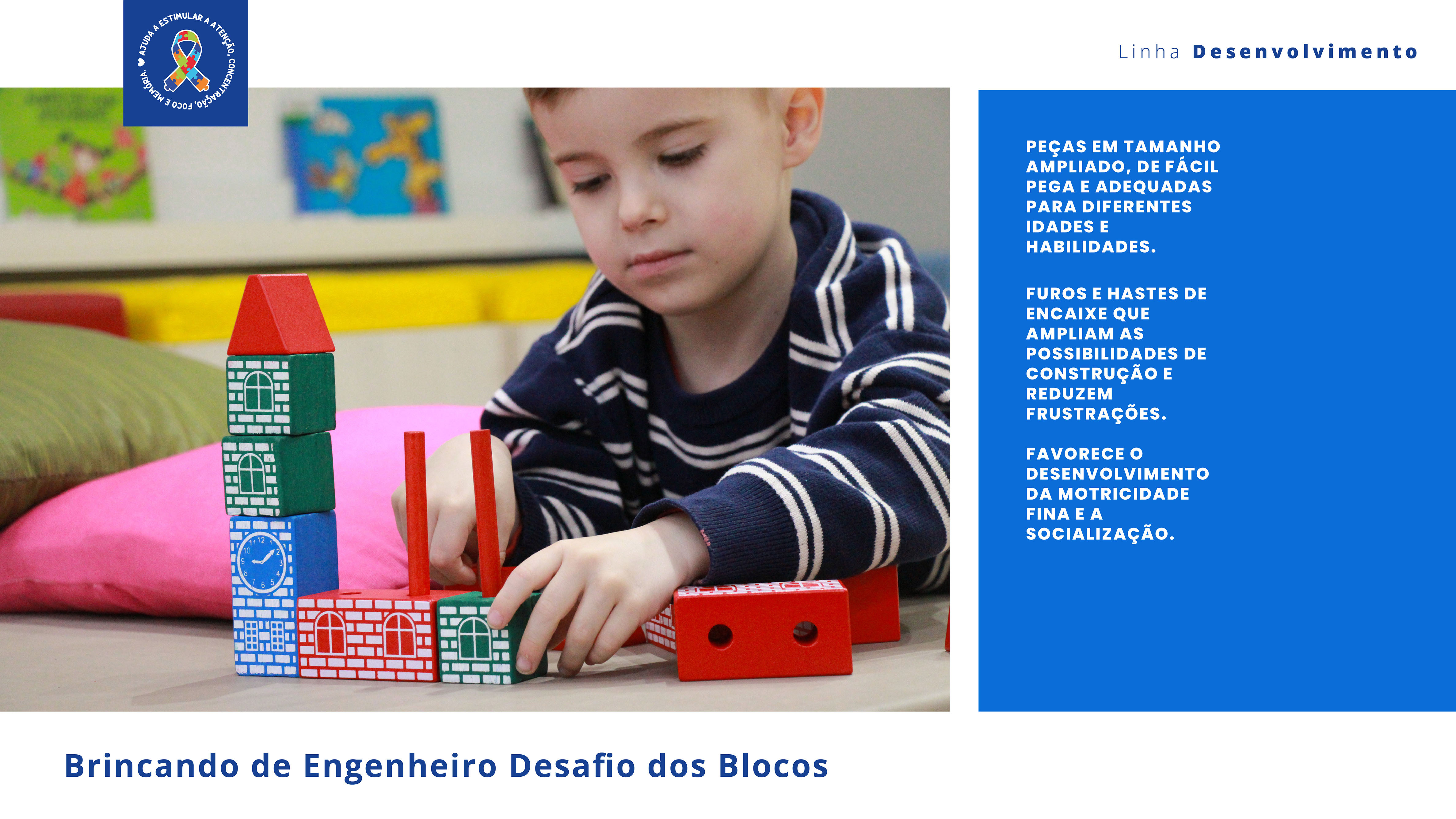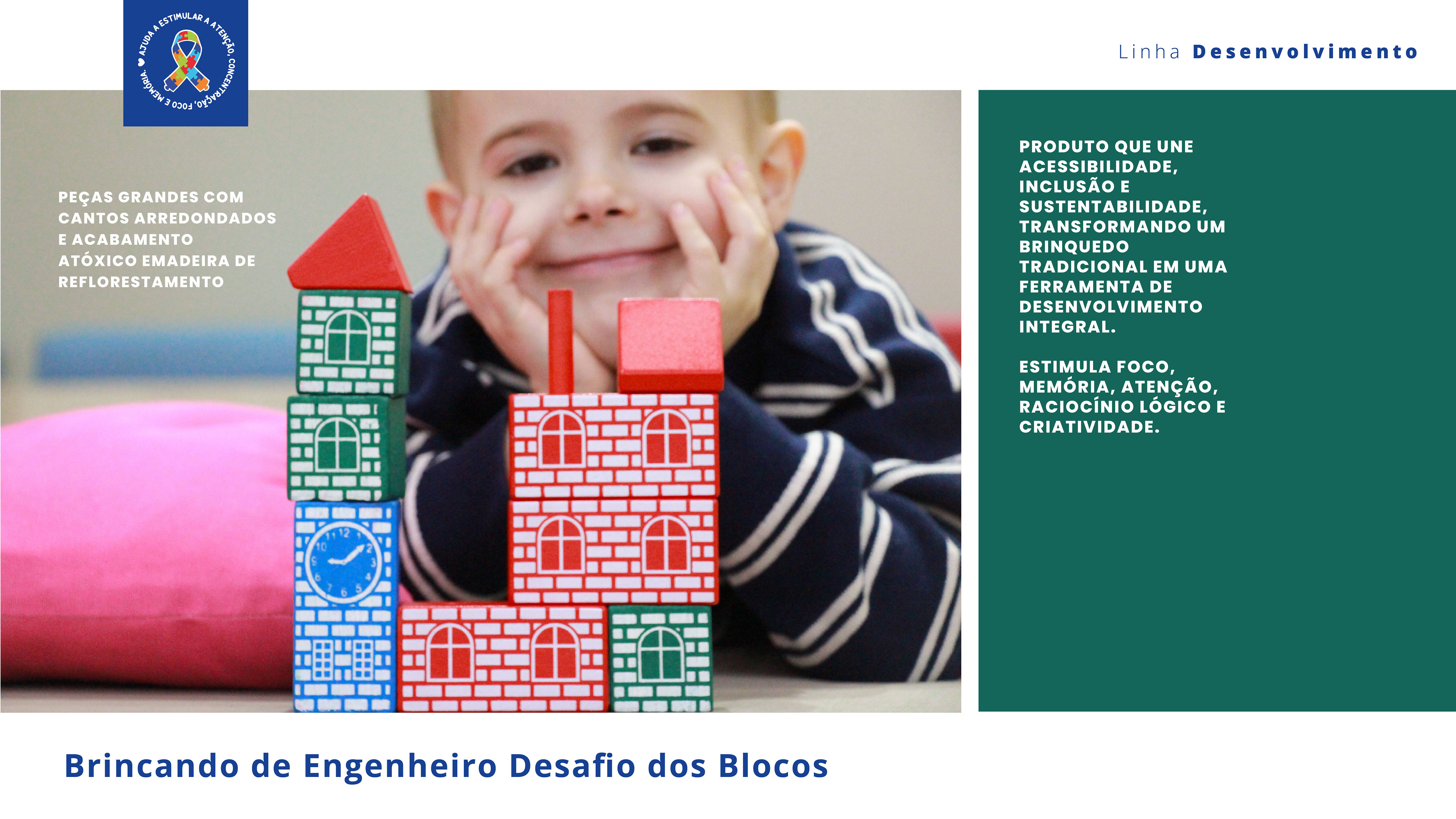 Votar neste projetoO Desafio dos Blocos é uma evolução inclusiva dos tradicionais blocos de montar. Fabricado em madeira reflorestada, o brinquedo possui peças em tamanho ampliado, com furos e hastes de encaixe que facilitam a montagem, a pega e o manuseio, promovendo o desenvolvimento cognitivo, motor e emocional de crianças típicas e atípicas.
