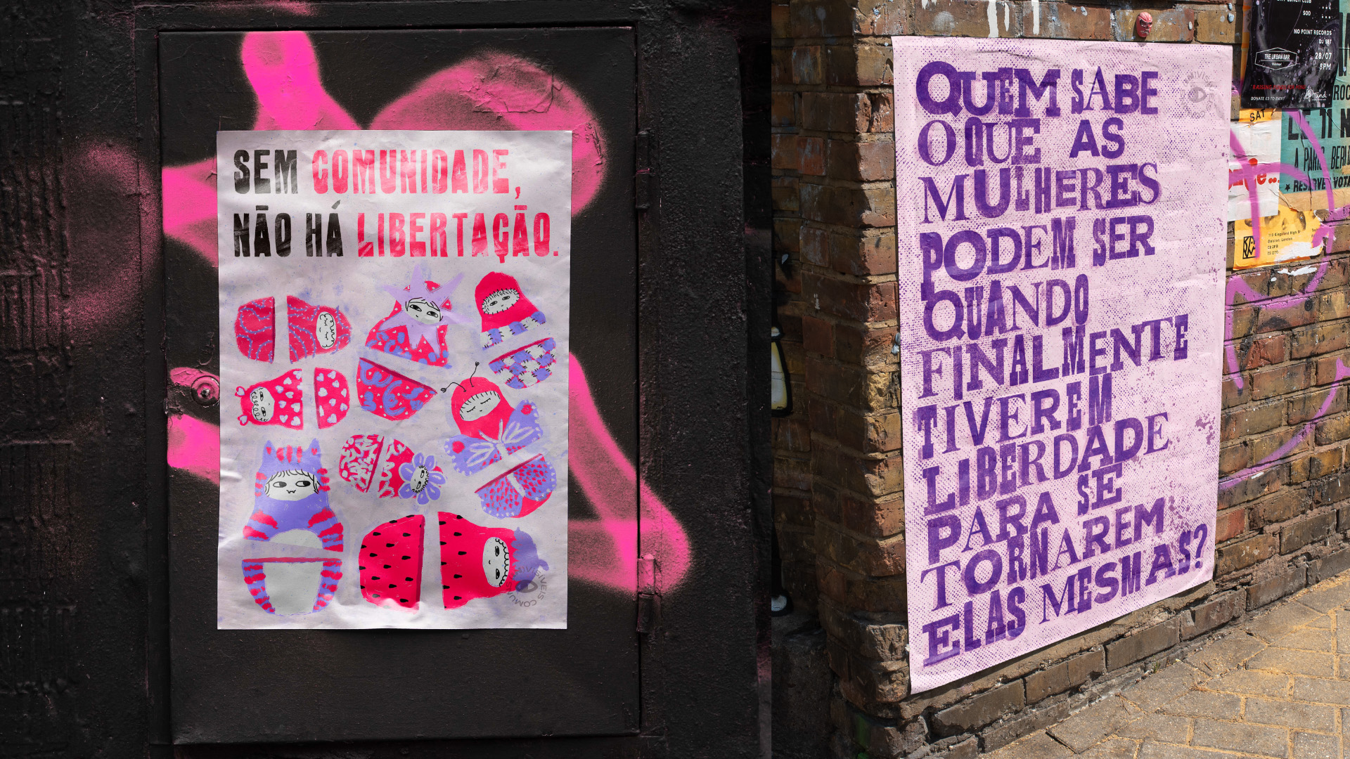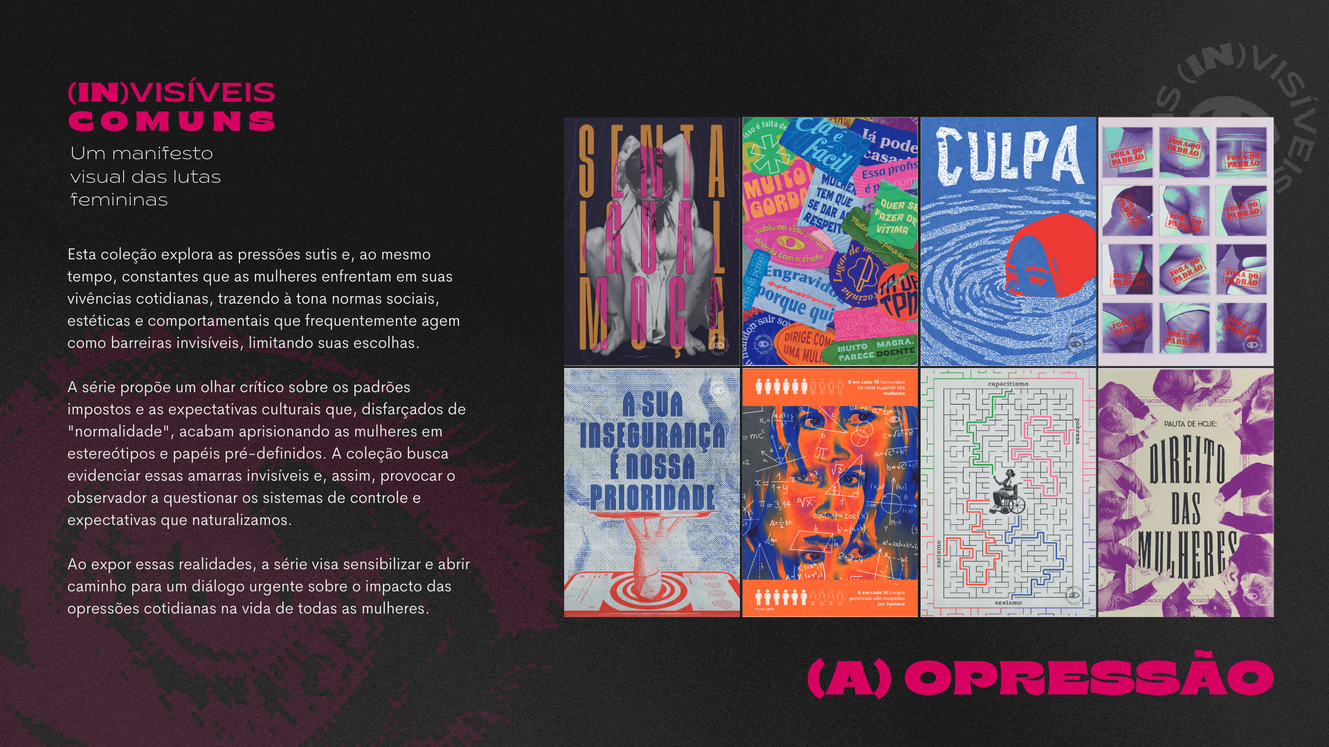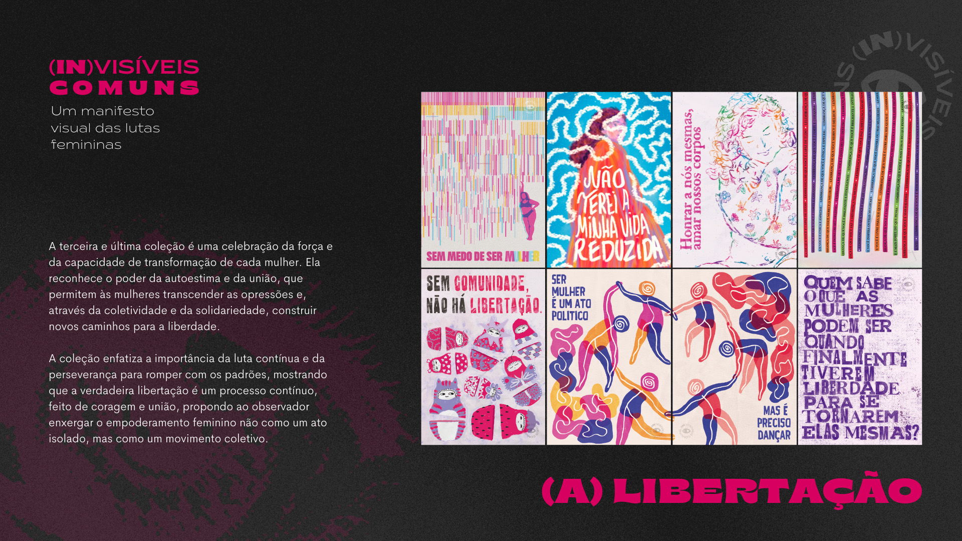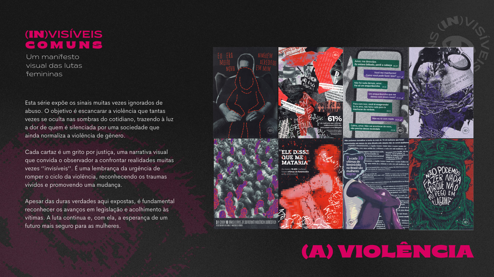 Votar neste projetoInvisíveis Comuns é um manifesto visual que transforma o design em ferramenta de mobilização social. O projeto reúne três coleções de cartazes: (A) Violência, (A) Opressão e (A) Libertação, criados para o formato lambe-lambe e difusão digital. Seu diferencial está em extrapolar o ambiente acadêmico e propor uma plataforma colaborativa de livre acesso: os 24 cartazes podem ser baixados no site invisiveiscomuns.com, impressos e usados em intervenções urbanas, tornando-se um movimento coletivo e acessível de visibilização das lutas femininas.