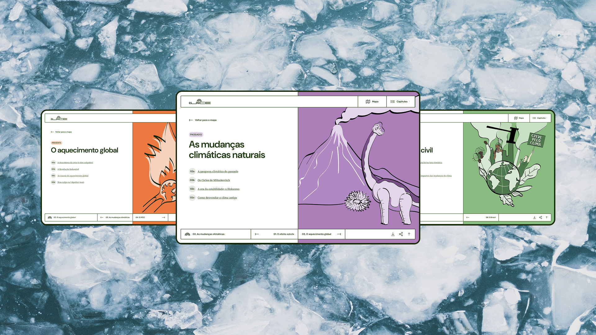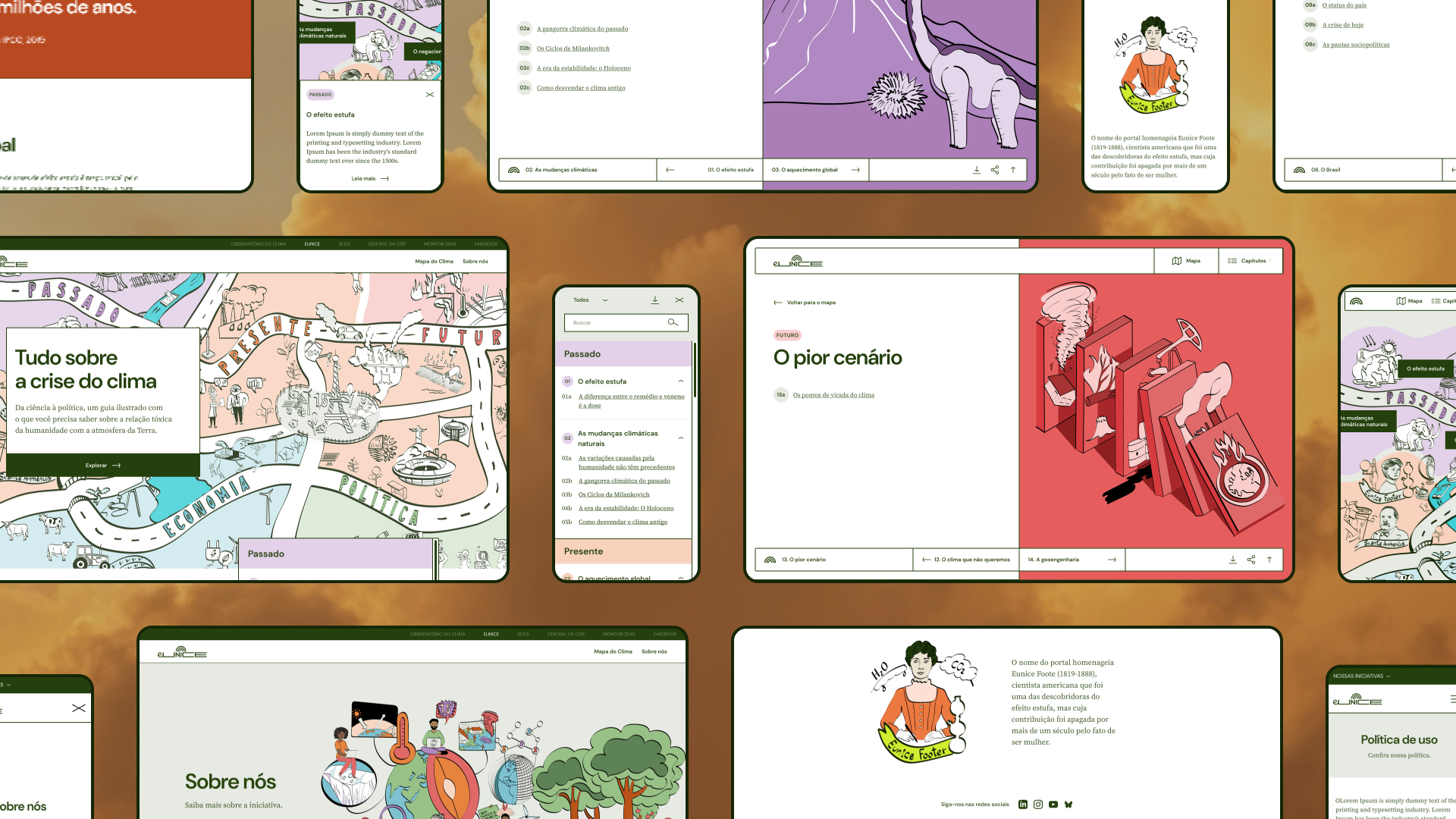 Votar neste projetoEunice é uma plataforma criada pelo Observatório do Clima para ampliar o acesso à informação e educar sobre a crise climática de forma inteligente e com humor. O nome homenageia Eunice Foote (1819–1888), cientista norte-americana que foi uma das descobridoras do efeito estufa, mas cuja contribuição permaneceu invisibilizada por mais de um século pelo fato de ser mulher. A construção do projeto envolveu um processo profundo de pesquisa com públicos diversos e etapas colaborativas com especialistas e profissionais da organização. Com interface ilustrada, inspirada em placas de sinalização, e navegação intuitiva, o resultado é uma experiência digital que traduz informações técnicas e complexas em conteúdo leve, acessível e compartilhável.