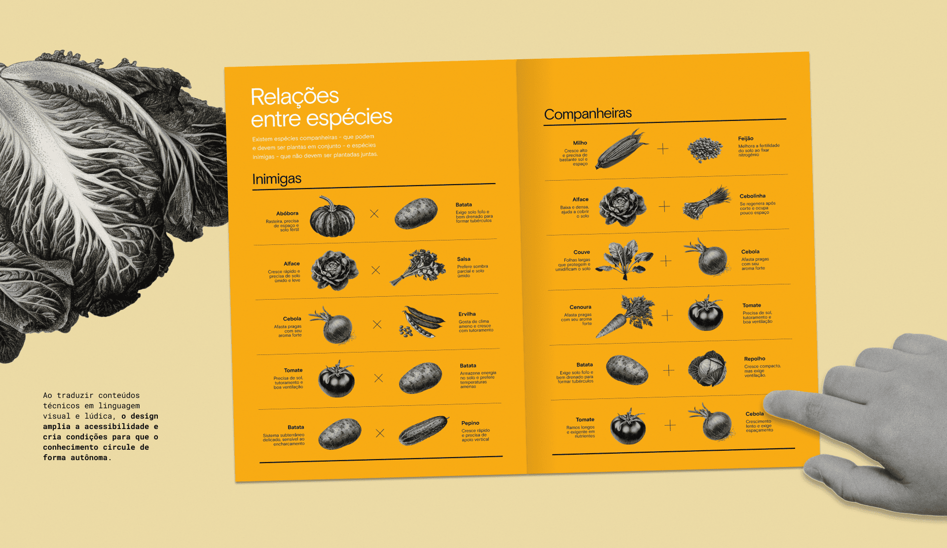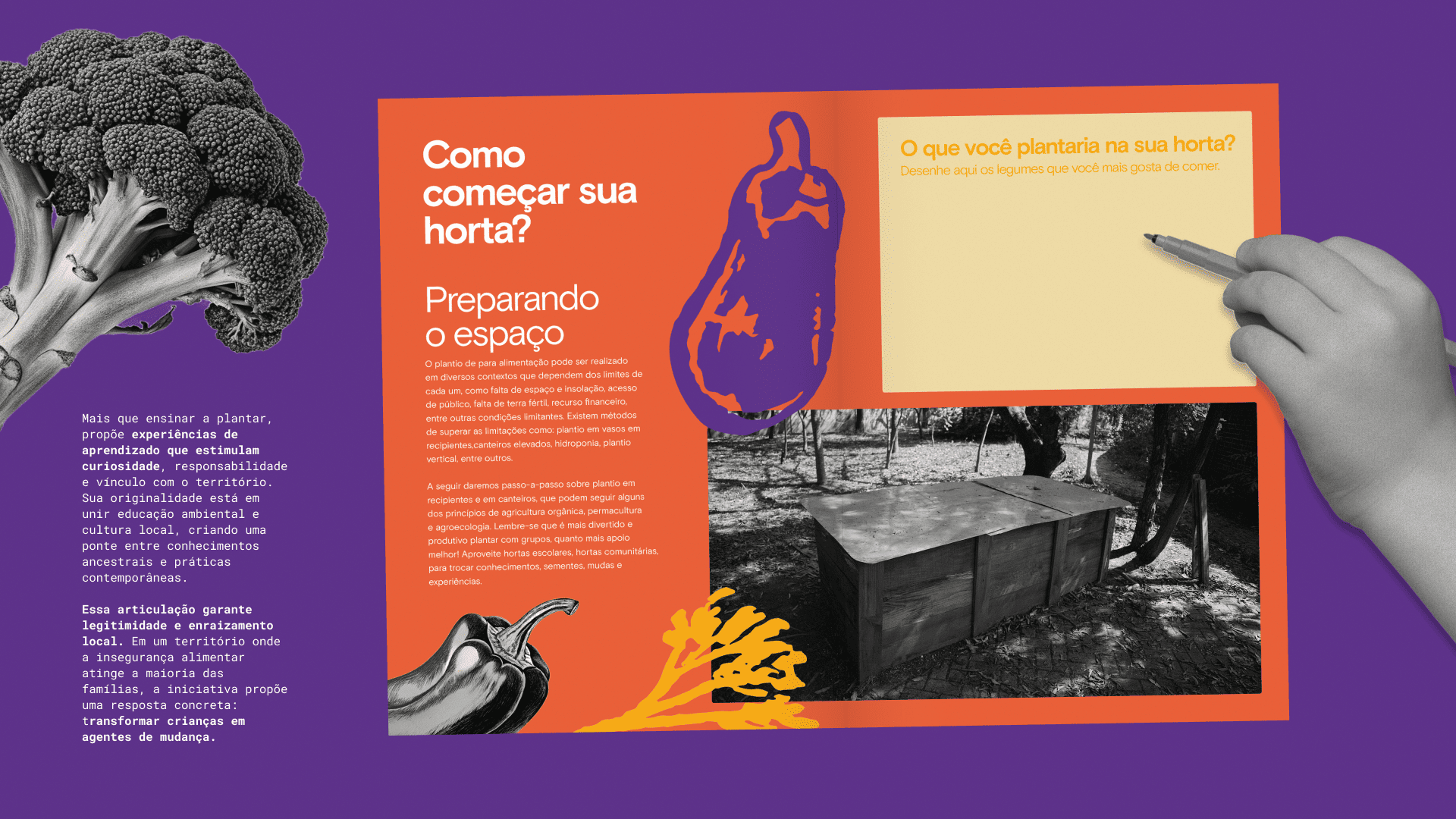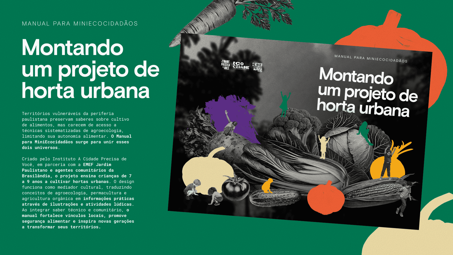 Votar neste projetoTerritórios vulneráveis da periferia paulistana preservam saberes sobre cultivo de alimentos, mas carecem de técnicas sistematizadas de agroecologia, o que limita sua autonomia alimentar. O Manual para MiniEcocidadãos une esses dois universos. Criado pelo Instituto A Cidade Precisa de Você, em parceria com a EMEF Jardim Paulistano e agentes comunitários da Brasilândia, o projeto ensina crianças de 7 a 9 anos a cultivar hortas urbanas. O design atua como mediador cultural, traduzindo conceitos de agroecologia, permacultura e agricultura orgânica em práticas ilustradas e lúdicas. Ao integrar saber técnico e comunitário, o manual fortalece vínculos locais, promove segurança alimentar e inspira novas gerações a transformar seus territórios.
