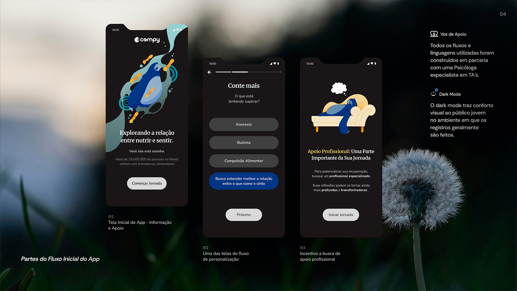 Votar neste projetoSegundo a Agência Câmara de Notícias (2024) e o Ministério da Saúde (2022), os Transtornos Alimentares (TAs) afetam cerca de 15 milhões de brasileiros, sobretudo jovens entre 15 e 25 anos, sendo as doenças psiquiátricas com maior taxa de mortalidade. A anorexia, por exemplo, alcança índices de até 20%. Um dos maiores desafios identificados em entrevistas com jovens e uma psicóloga especialista é a perda de informações emocionais entre consultas, o que compromete diagnósticos e tratamentos. A Compy foi criada para preencher essa lacuna, oferecendo uma ferramenta digital inovadora, segura e culturalmente adaptada ao Brasil, capaz de aproximar pacientes e profissionais por meio de registros contínuos e acolhedores.
