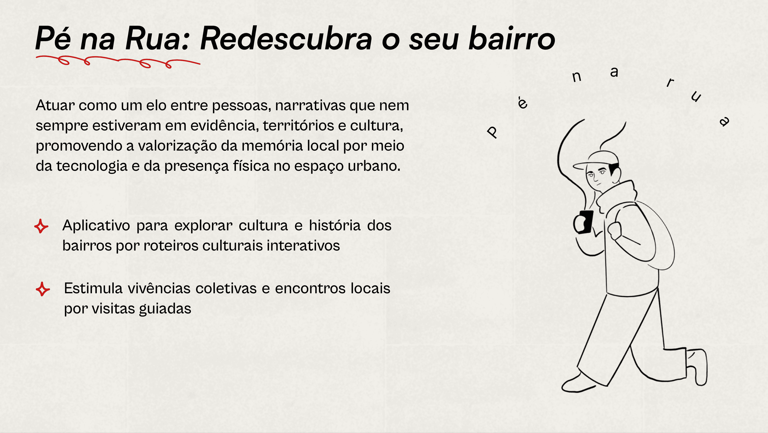 Votar neste projetoO projeto nasce do desejo de revelar a potência cultural dos bairros de São Paulo, valorizando a memória local e aproximando as pessoas de seu próprio território. Inspirado por iniciativas comunitárias e pela crença de que a cultura deve ser acessível a todos, propõe uma plataforma digital com roteiros culturais interativos, visitas guiadas e instalações artísticas nas ruas. Ao unir tecnologia e presença física no espaço urbano, estimula encontros, pertencimento e cidadania. A inovação está em transformar trajetos cotidianos em experiências culturais espontâneas, promovendo a redescoberta do bairro e de suas histórias, e incentivando conexões genuínas entre moradores, espaços e memórias.