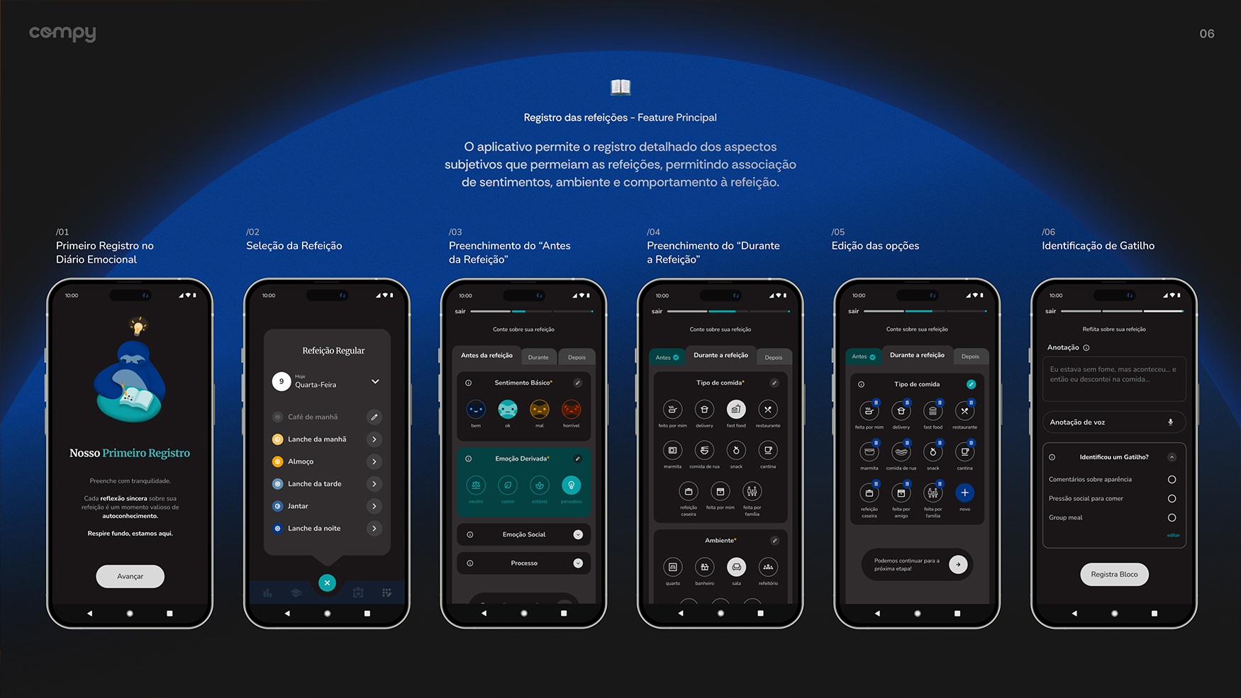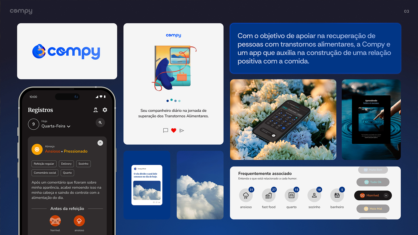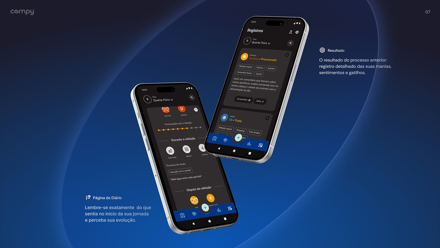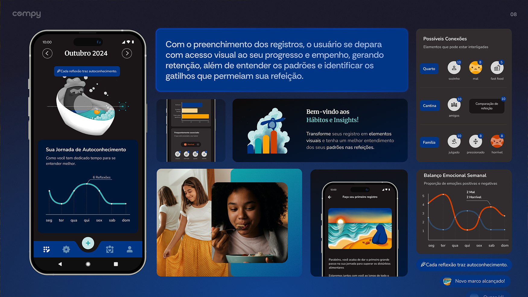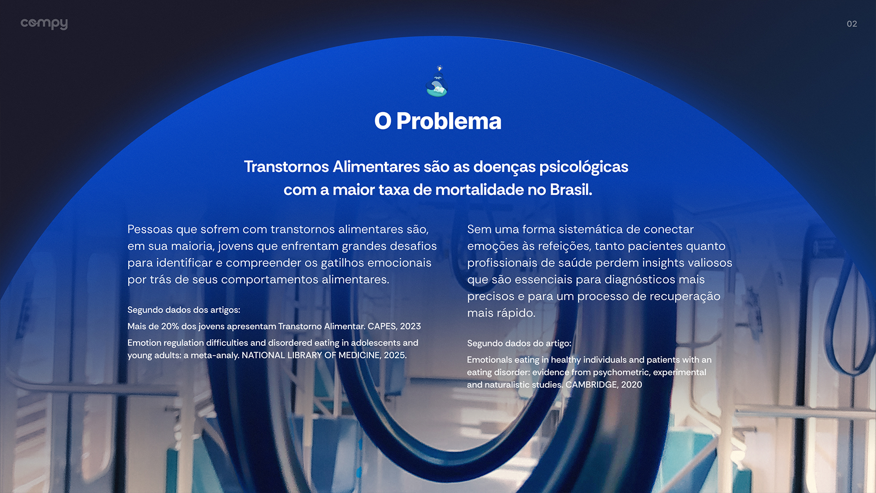 Votar neste projetoSegundo a Agência Câmara de Notícias (2024) e o Ministério da Saúde (2022), os Transtornos Alimentares (TAs) afetam cerca de 15 milhões de brasileiros, sobretudo jovens entre 15 e 25 anos, sendo as doenças psiquiátricas com maior taxa de mortalidade. A anorexia, por exemplo, alcança índices de até 20%. Um dos maiores desafios identificados em entrevistas com jovens e uma psicóloga especialista é a perda de informações emocionais entre consultas, o que compromete diagnósticos e tratamentos. A Compy foi criada para preencher essa lacuna, oferecendo uma ferramenta digital inovadora, segura e culturalmente adaptada ao Brasil, capaz de aproximar pacientes e profissionais por meio de registros contínuos e acolhedores.