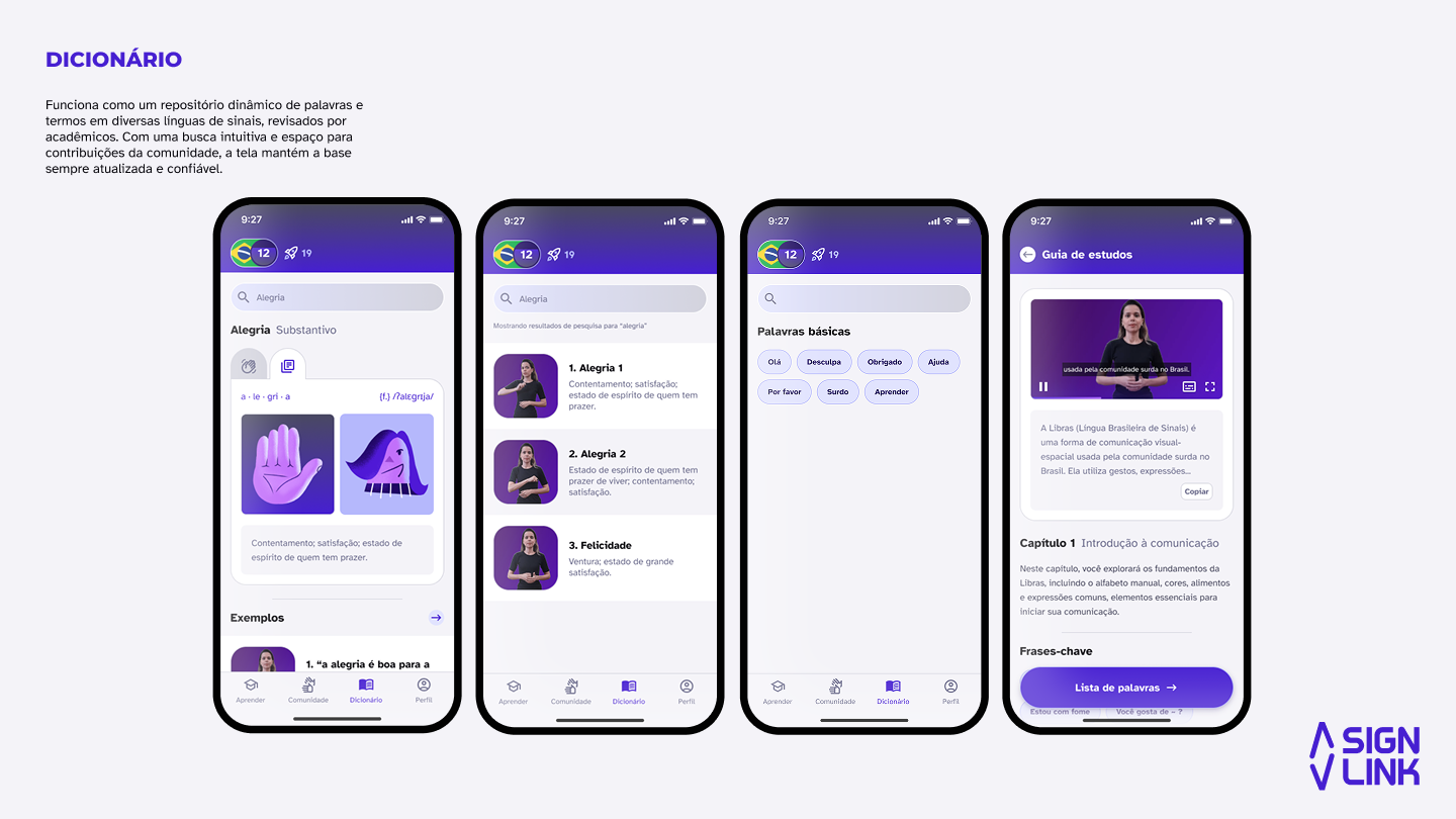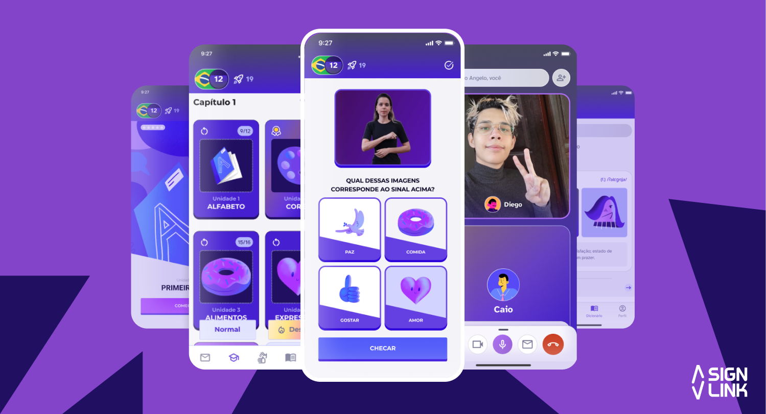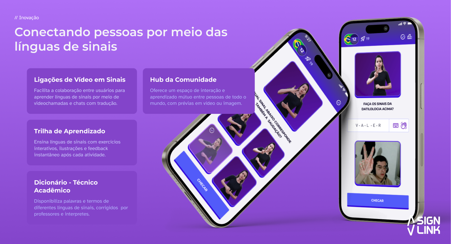 Votar neste projetoA Sign Link é um aplicativo que ensina línguas de sinais com design inclusivo e inovador. Inclui trilhas gamificadas, dicionário colaborativo, prática com falantes nativos e feedback por IA. Desenvolvido em parceria com Letras Libras da UFJF e validado por mais de 250 usuários, prioriza clareza, contraste e identidade própria. Em pré-lançamento, já conta com parcerias com universidades, empresas e governos e potencial de entrada no México, Suíça e EUA. É uma solução escalável que atende instituições, familiares e entusiastas e permite que estudantes surdos aprendam mais de uma língua, ampliando horizontes globais.