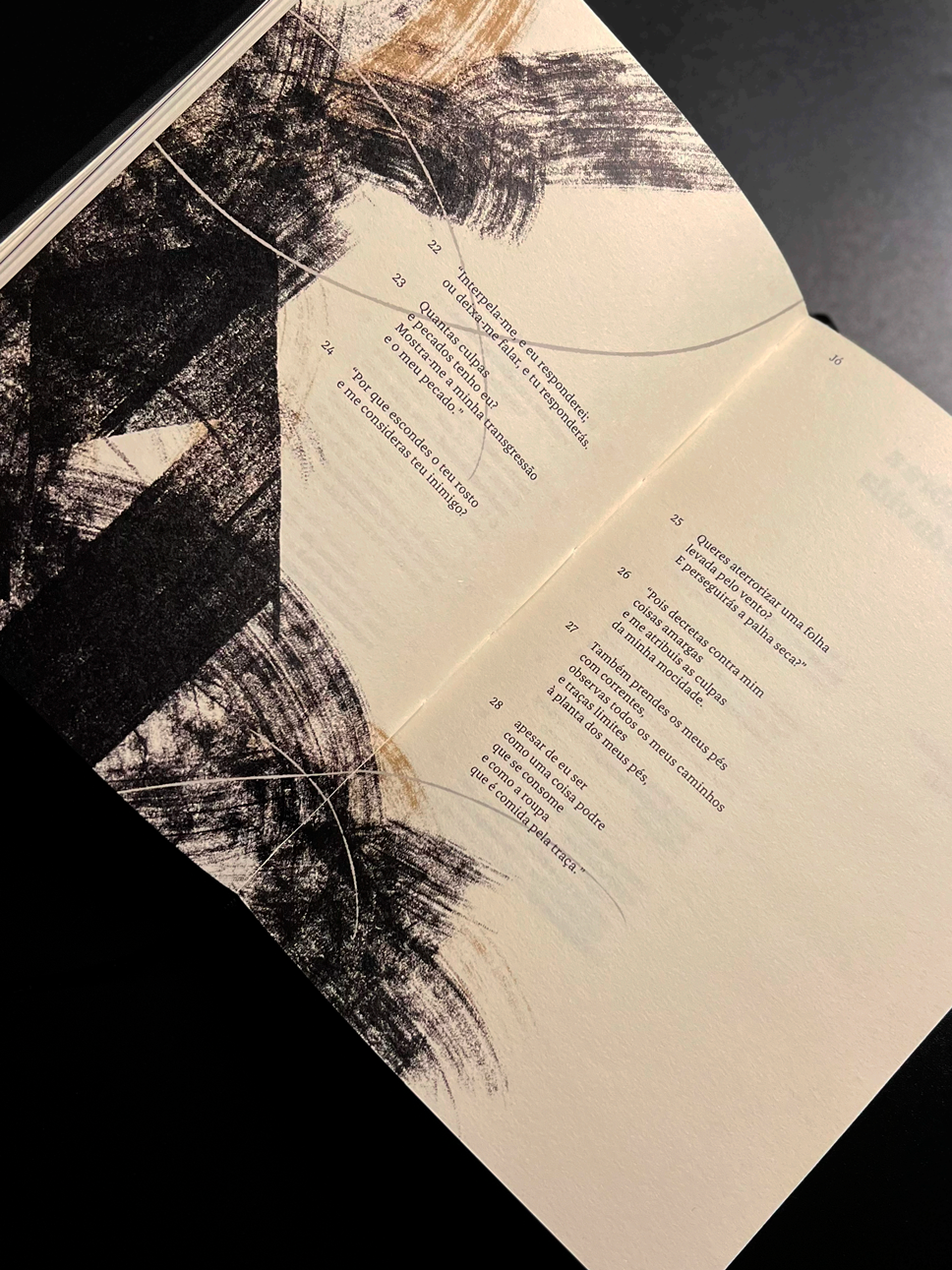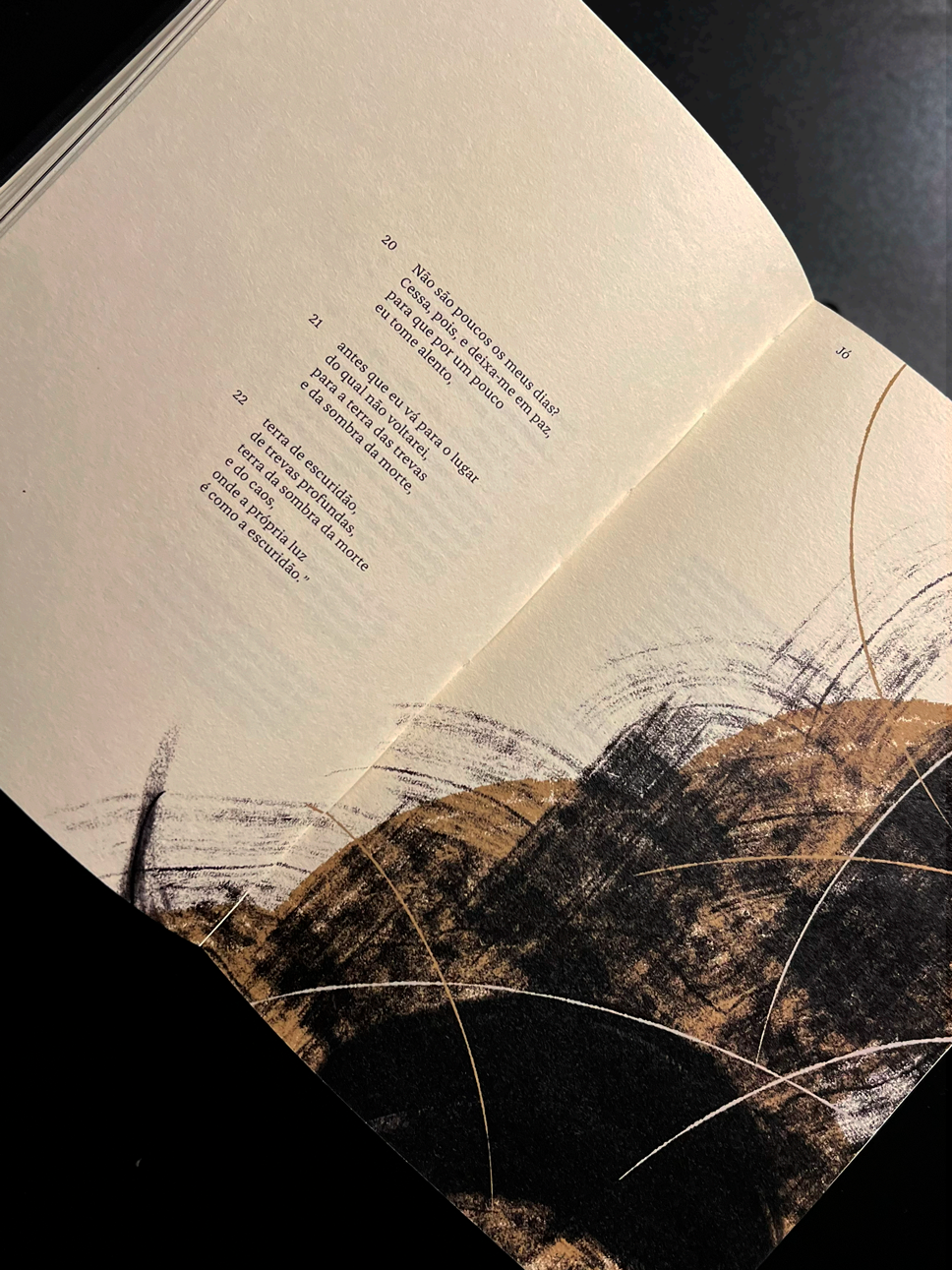 Votar neste projetoCriação de projeto gráfico para livro bíblico de Jó tendo como foco valorizar e conscientizar acerca dos elementos artísticos da obra. Propondo uma nova abordagem gráfica, que busca dialogar a temática do livro (a natureza do sofrimento) com a sociedade contemporânea. Esse projeto traz o texto em uma diagramação mais condizente com a natureza poética do livro, diferenciando-o das edições correntes. Representando o estado psicológico do personagem há ilustrações com inspiração caligráfica, as quais se transformam progressivamente junto ao texto. Além disso há também uma conexão com o leitor através de textos auxiliares e interação digital. Todo o projeto tem como objetivo dar relevância cultural e convidar novos leitores à obra, a partir de uma nova e atrativa estética gráfica.