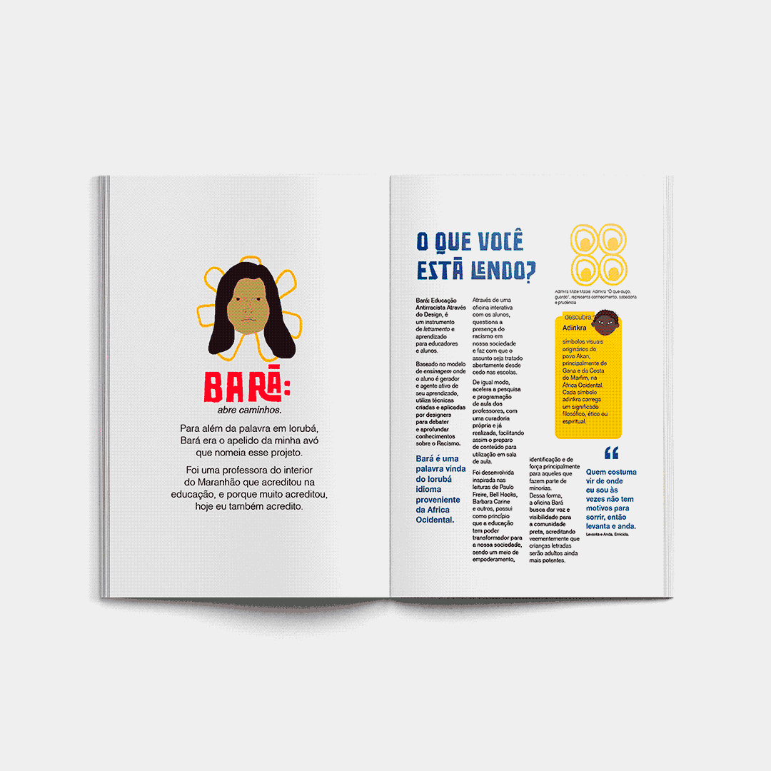 Votar neste projetoO projeto Oficina Bará: Design e Educação Antirracista propõe a aplicação da metodologia do Design Thinking como caminho para professores da educação infantil trabalharem raça, identidade e cultura afro-brasileira em sala de aula. A partir da análise dos desafios da escola pública, como desigualdade de recursos, racismo estrutural e sobrecarga docente, foi criada uma oficina prática e interativa, aplicada na EMEI Fátima Regina, em São Paulo, que resultou em uma cartilha pedagógica para apoiar educadores. O design é o fio condutor de toda a proposta, estruturando a oficina nas quatro etapas do Design Thinking: descobrir, definir, desenvolver e entregar. Oferecendo recursos visuais acessíveis para aplicação em sala de aula.