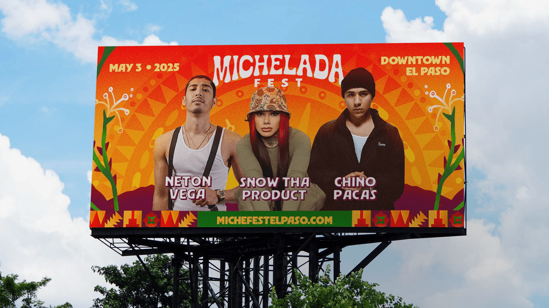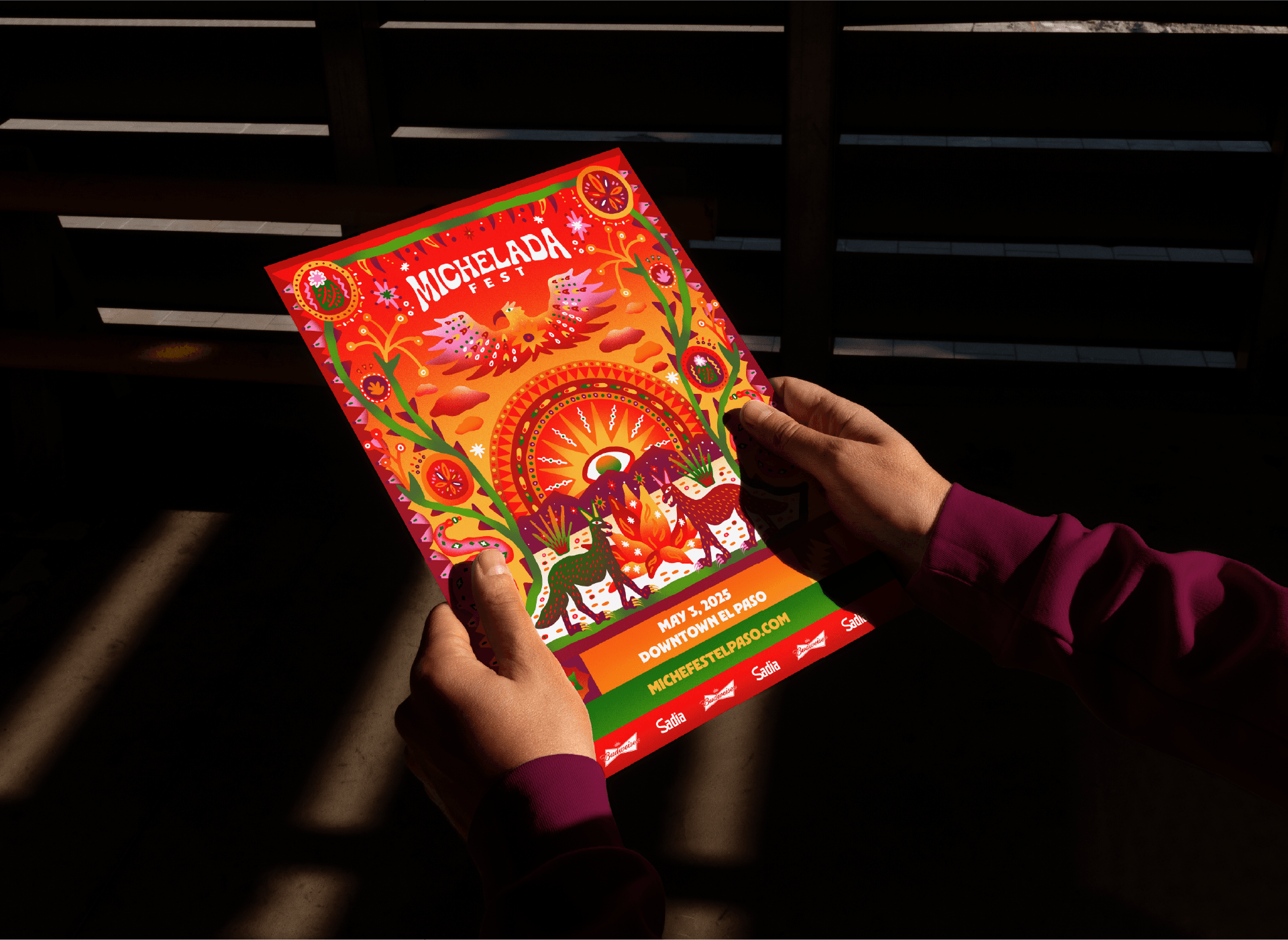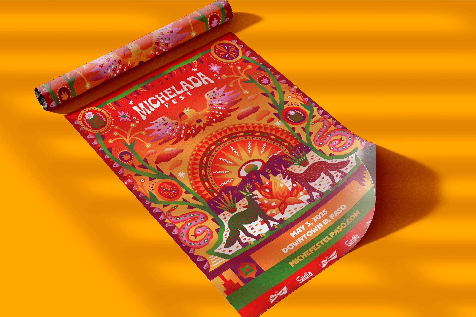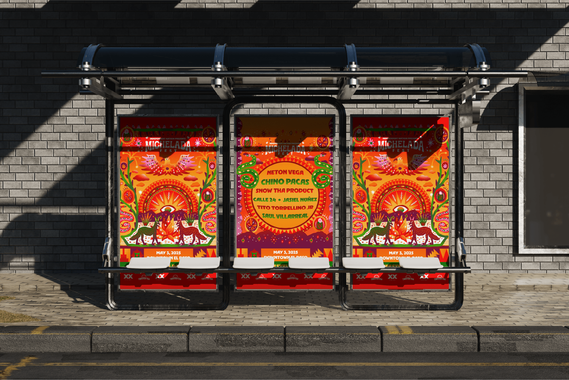 Votar neste projetoO cartaz produzido para o Michelada Fest El Paso sintetiza a identidade visual do festival de música latina. Reunindo elementos gráficos que celebram a cultura da fronteira entre México e Estados Unidos, construímos uma composição simétrica com traços inspirados na cerâmica tradicional mexicana, na fauna regional e em cores quentes que evocam o deserto e o pôr do sol característico da região. O sol, símbolo central, representa El Paso, conhecida como Sun City. A linguagem visual desenvolvida para o evento aposta em uma estética autoral e expressiva, tendo o cartaz como um convite gráfico para um festival que valoriza cultura, juventude e latinidades.