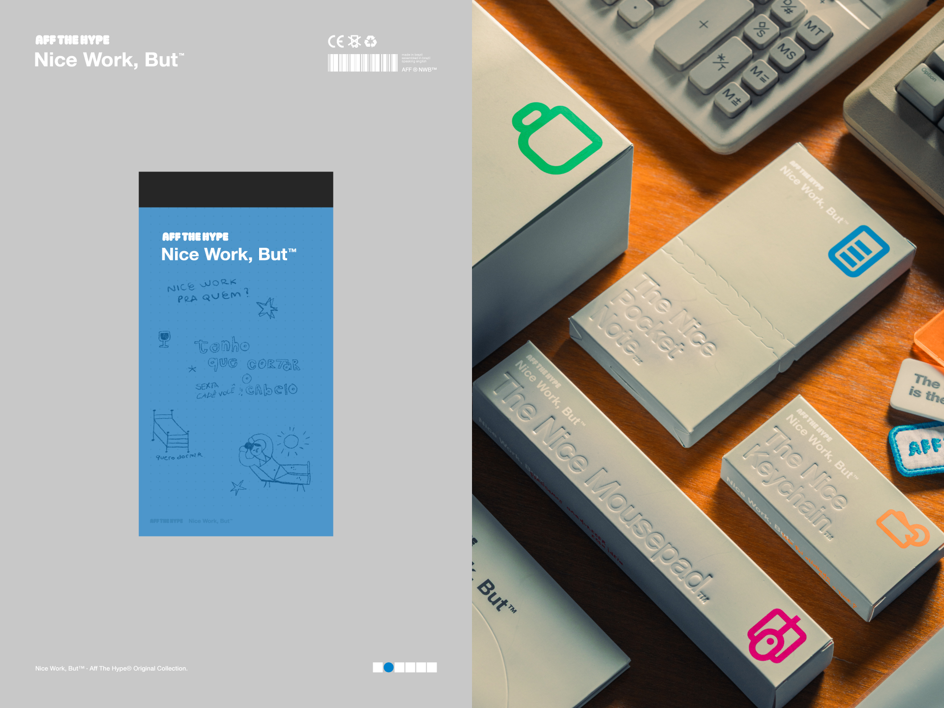 Votar neste projeto“Nice Work, But” nasceu para provocar. Criado em parceria com a Aff The Hype, marca com mais de 1,7 milhão de seguidores, com um tom de voz ácido e anticorporativo, o drop satiriza a cultura corporativa unindo humor e sofisticação gráfica. Nosso papel foi trazer frescor criativo em um momento em que os produtos começavam a se repetir. O resultado é uma coleção que à primeira vista parece minimalista e premium, com Helvetica, Pantones, relevos e papéis especiais, mas que revela ironia e crítica em rabiscos e anotações furiosas. Essa dualidade entre luxo e imperfeição transformou objetos de escritório em comentários visuais sobre a positividade tóxica do ambiente corporativo, projetando a Aff para um novo patamar de design e narrativa.