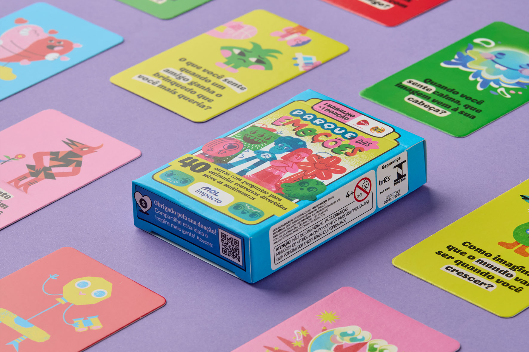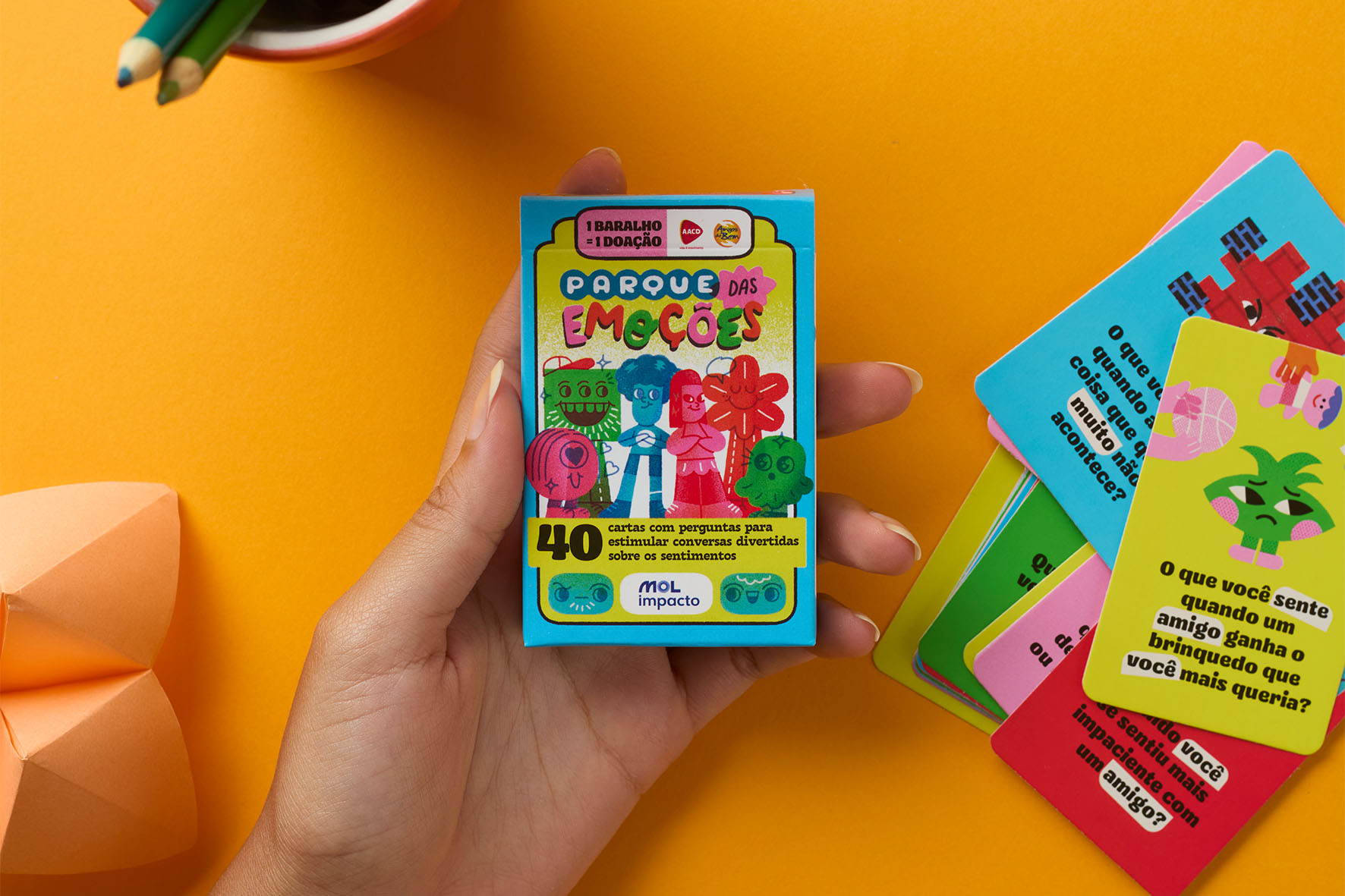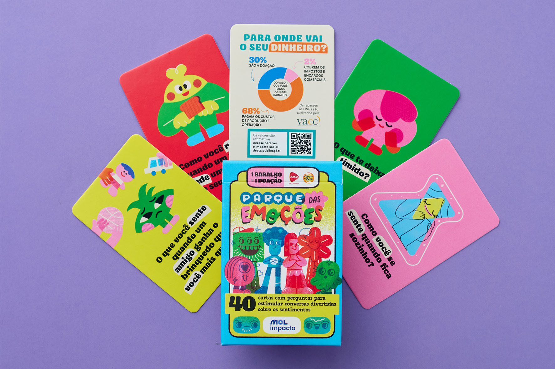 Votar neste projeto“Parque das Emoções” é um baralho feito para inspirar adultos e crianças a falar sobre os sentimentos de forma divertida. São 40 cartas que trazem, de um lado, uma ilustração e uma pergunta correspondente a uma emoção; e, do outro, uma explicação curta sobre por que nos sentimos assim e o que fazer para lidar com isso. Conversar com as crianças sobre emoções é fundamental para o desenvolvimento e a saúde mental delas. O formato de caixa e cartas estimula a interação de forma lúdica, seja em família, seja na escola e entre amigos. Além disso, a publicação também é um produto social com potencial de doação de mais de R$ 200 mil para 4 ONGs que trabalham pela saúde, educação e inclusão socioambiental no país.