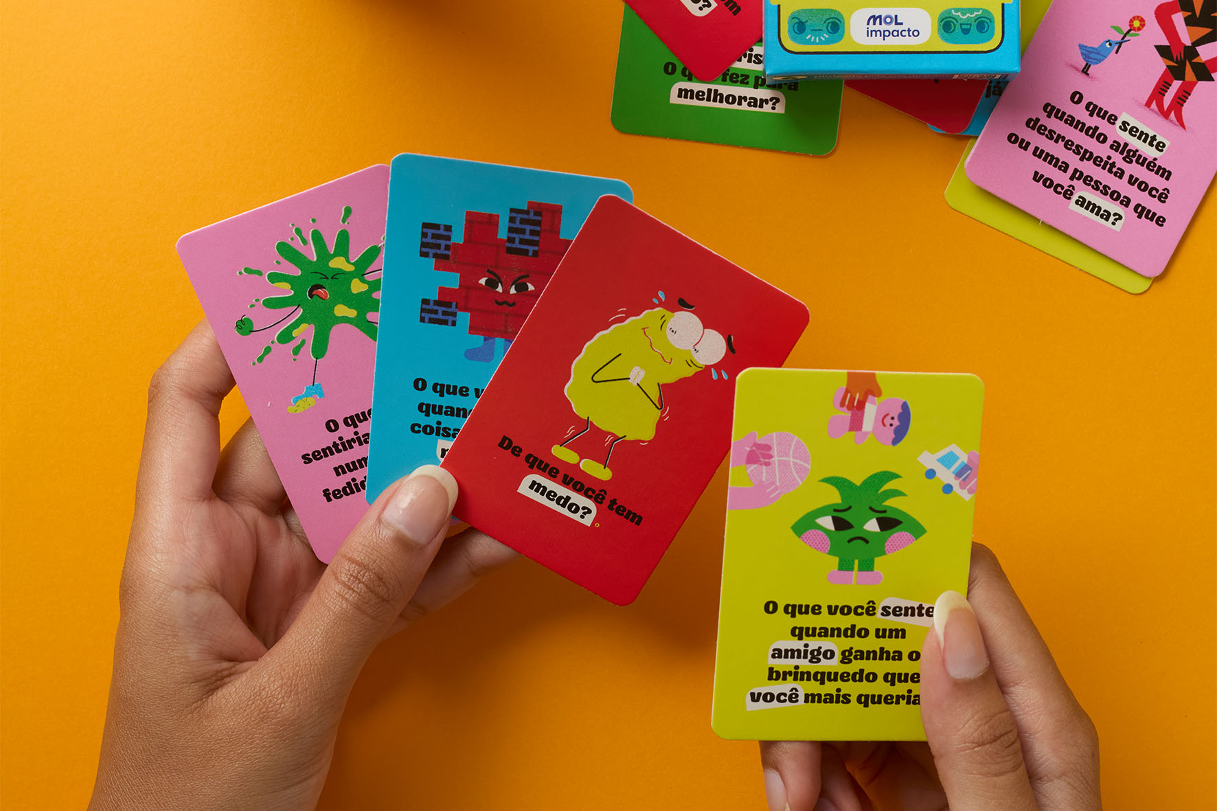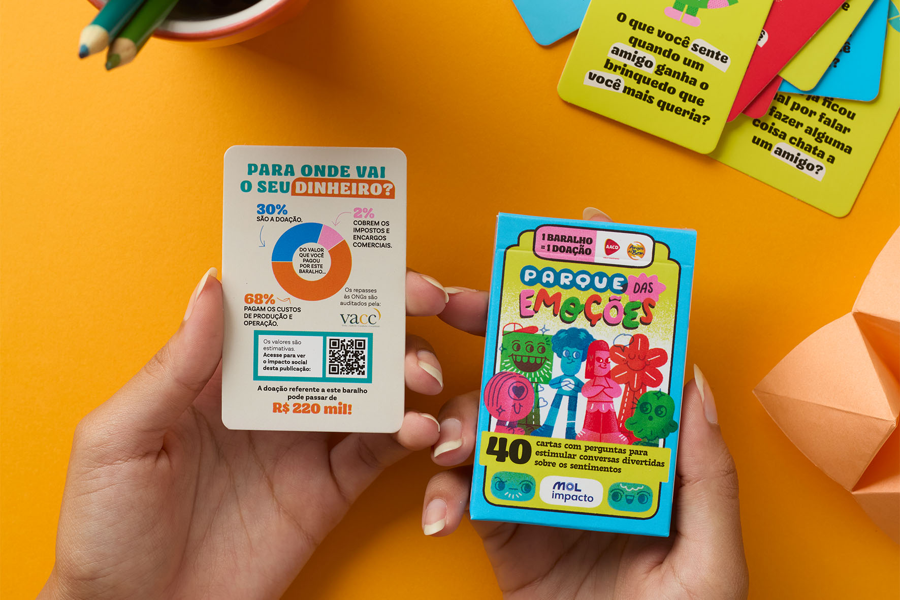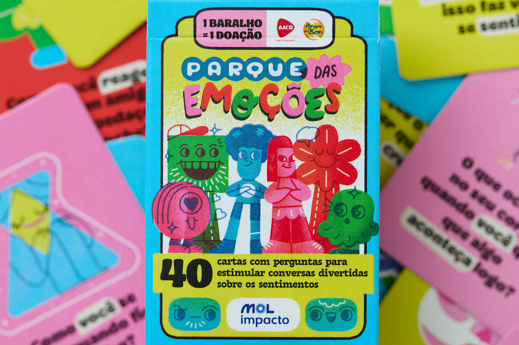 Votar neste projeto“Parque das Emoções” é um baralho feito para inspirar adultos e crianças a falar sobre os sentimentos de forma divertida. São 40 cartas que trazem, de um lado, uma ilustração e uma pergunta correspondente a uma emoção; e, do outro, uma explicação curta sobre por que nos sentimos assim e o que fazer para lidar com isso. Conversar com as crianças sobre emoções é fundamental para o desenvolvimento e a saúde mental delas. O formato de caixa e cartas estimula a interação de forma lúdica, seja em família, seja na escola e entre amigos. Além disso, a publicação também é um produto social com potencial de doação de mais de R$ 200 mil para 4 ONGs que trabalham pela saúde, educação e inclusão socioambiental no país.