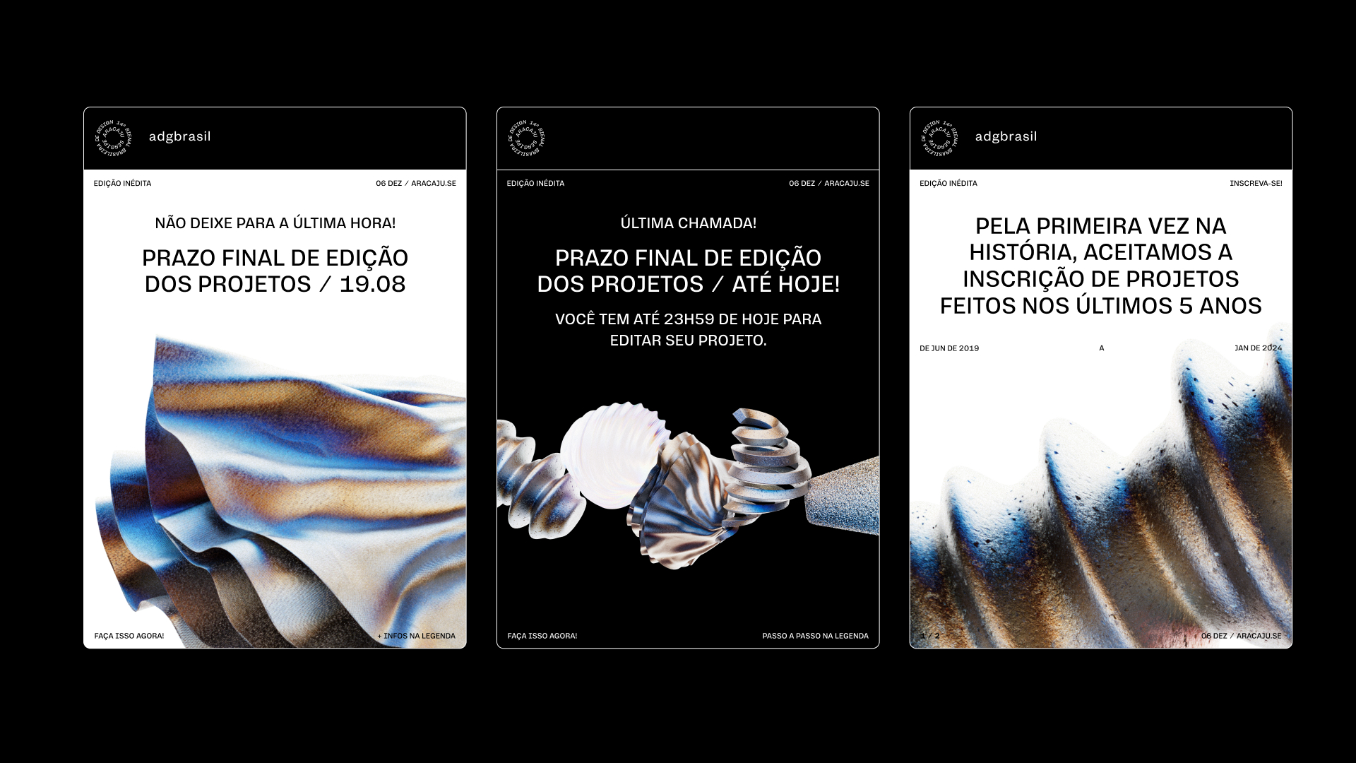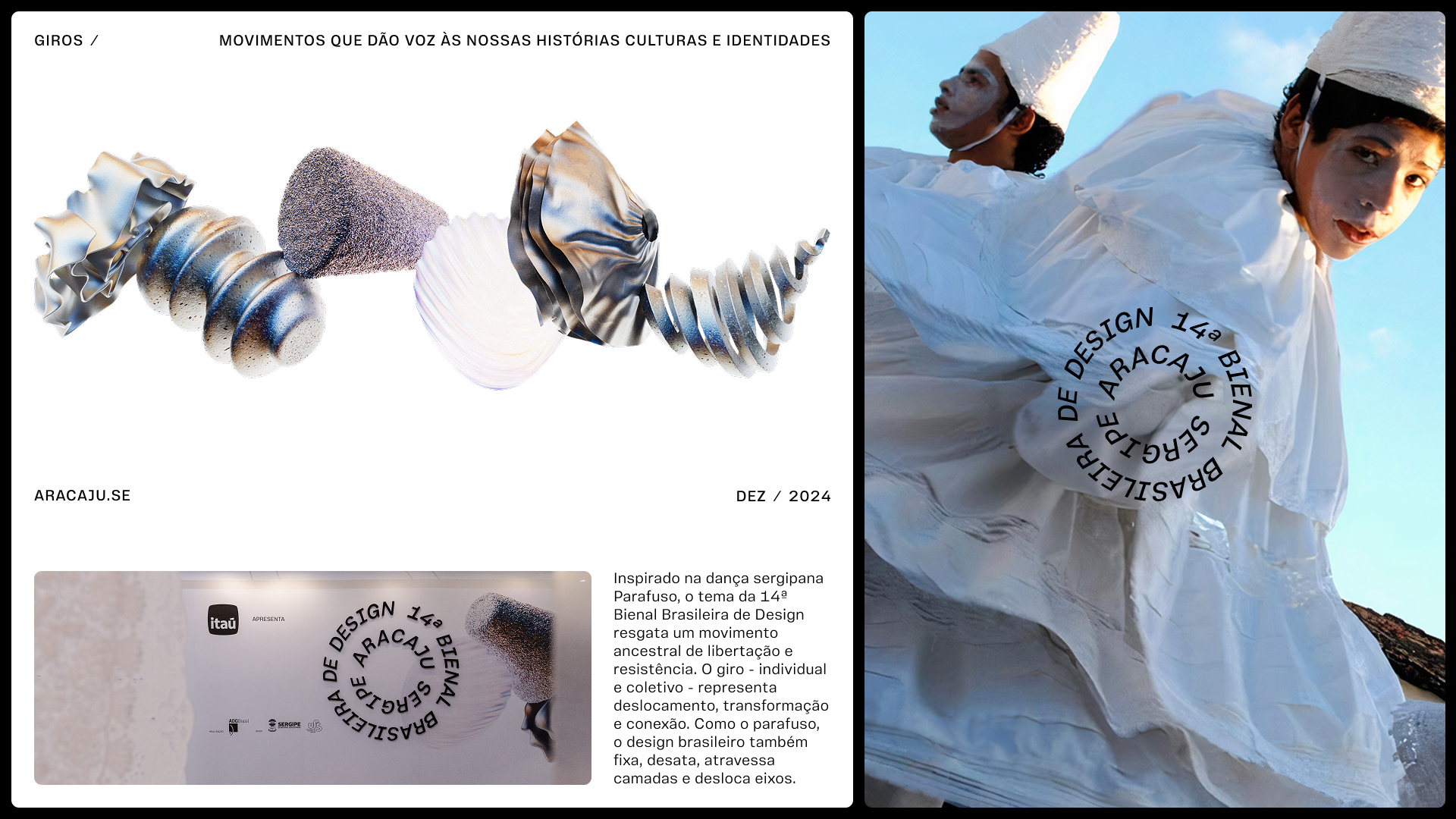 Votar neste projetoA 14ª Bienal Brasileira de Design foi realizada pela primeira no Nordeste, em Aracaju/SE, dando continuidade à proposta da ADG de descentralizar o olhar e valorizar a diversidade do Brasil. A identidade inspira-se na dança “Parafusos”, patrimônio histórico, cultural e imaterial do estado de Sergipe, para traduzir o tema “Giros: movimentos que dão voz às nossas histórias, culturas e identidades”. O giro representa deslocamento, transformação e conexão: como o parafuso, o design brasileiro também fixa, desata, atravessa camadas e desloca eixos. Com um logotipo que dança em giro e imagens 3D iridescentes que homenageiam elementos locais, o sistema rompe a estética estereotipada de representação do Nordeste e se afirma como uma identidade essencialmente em movimento, sensorial e simbólica.