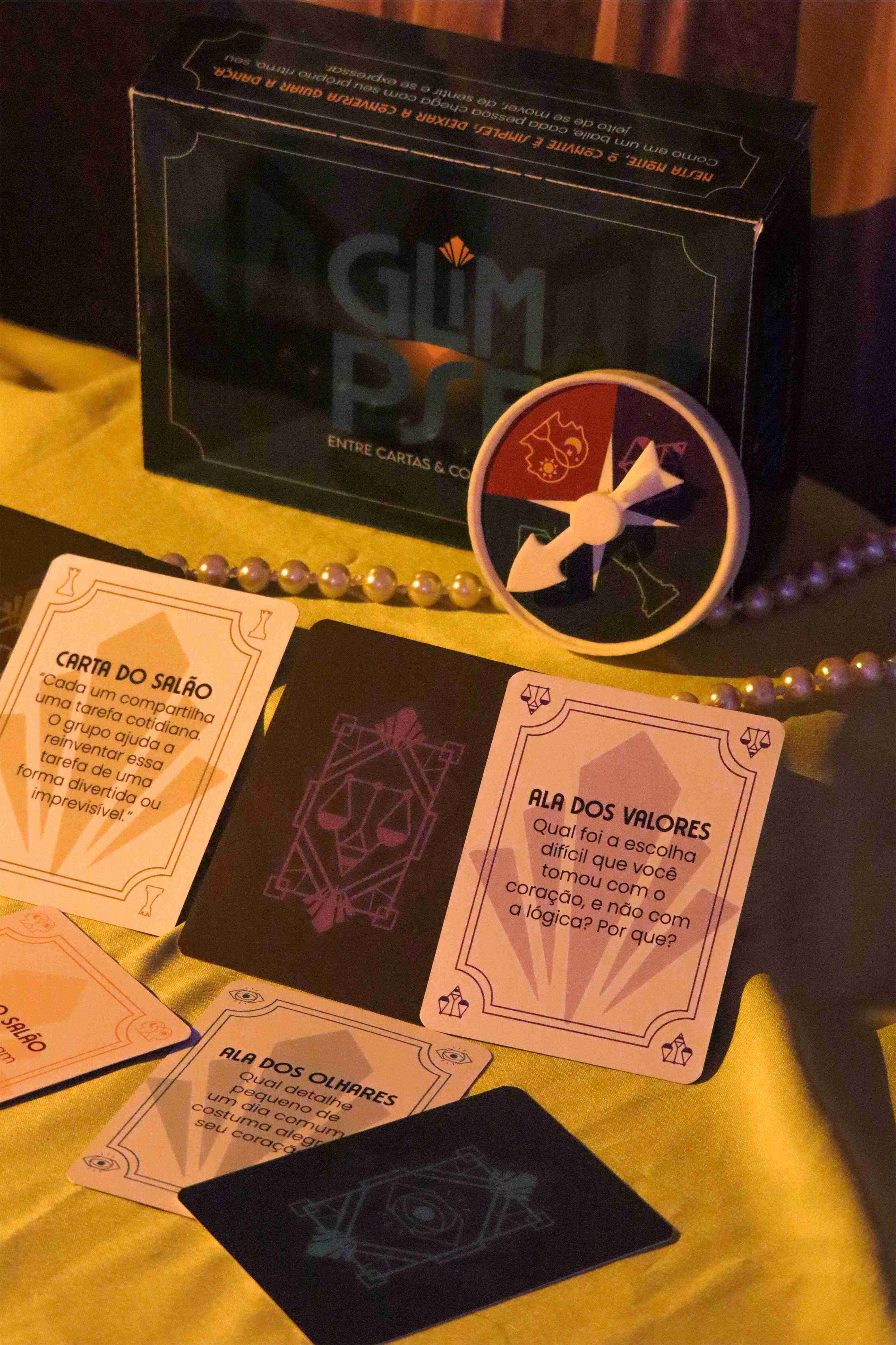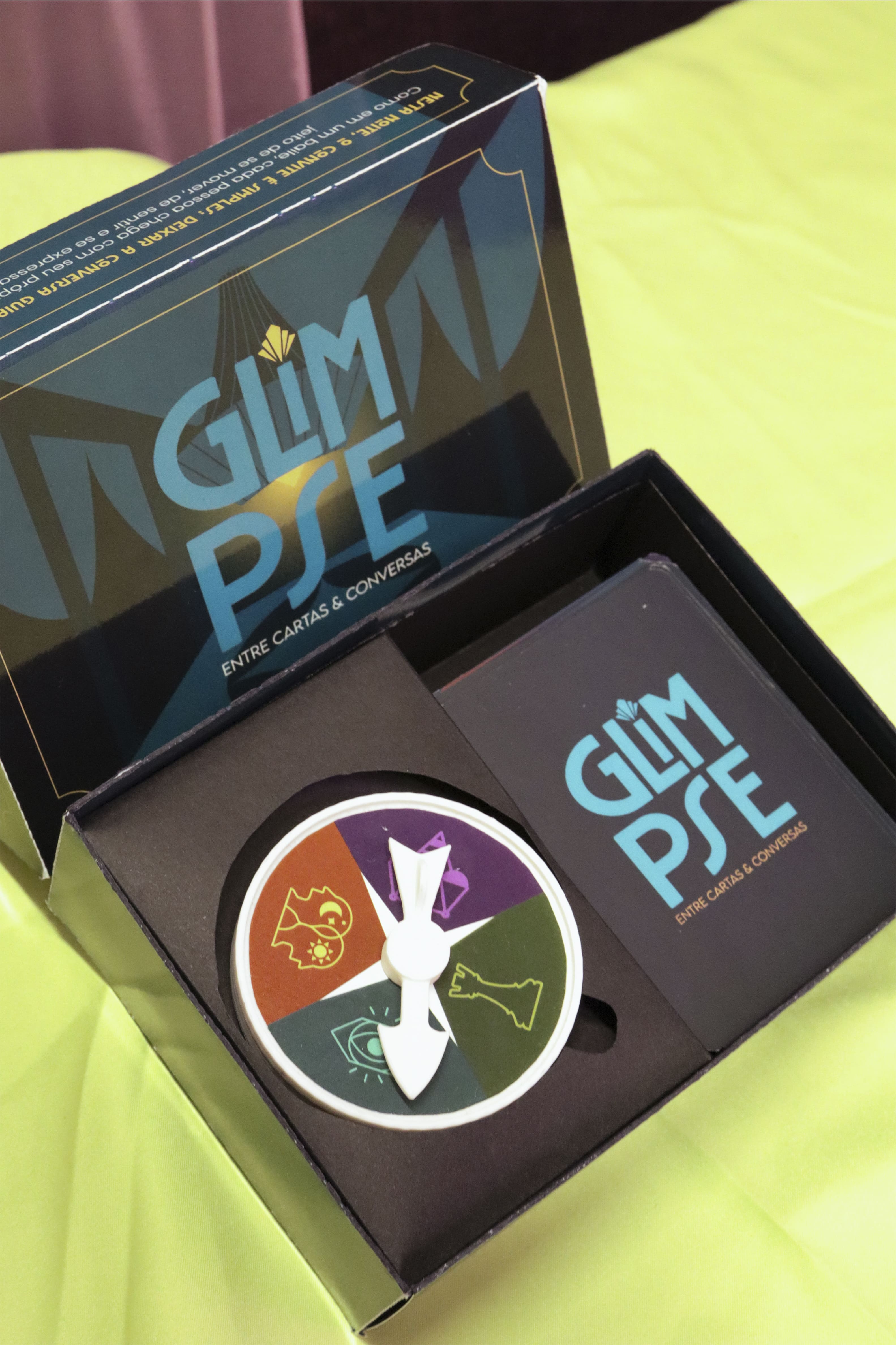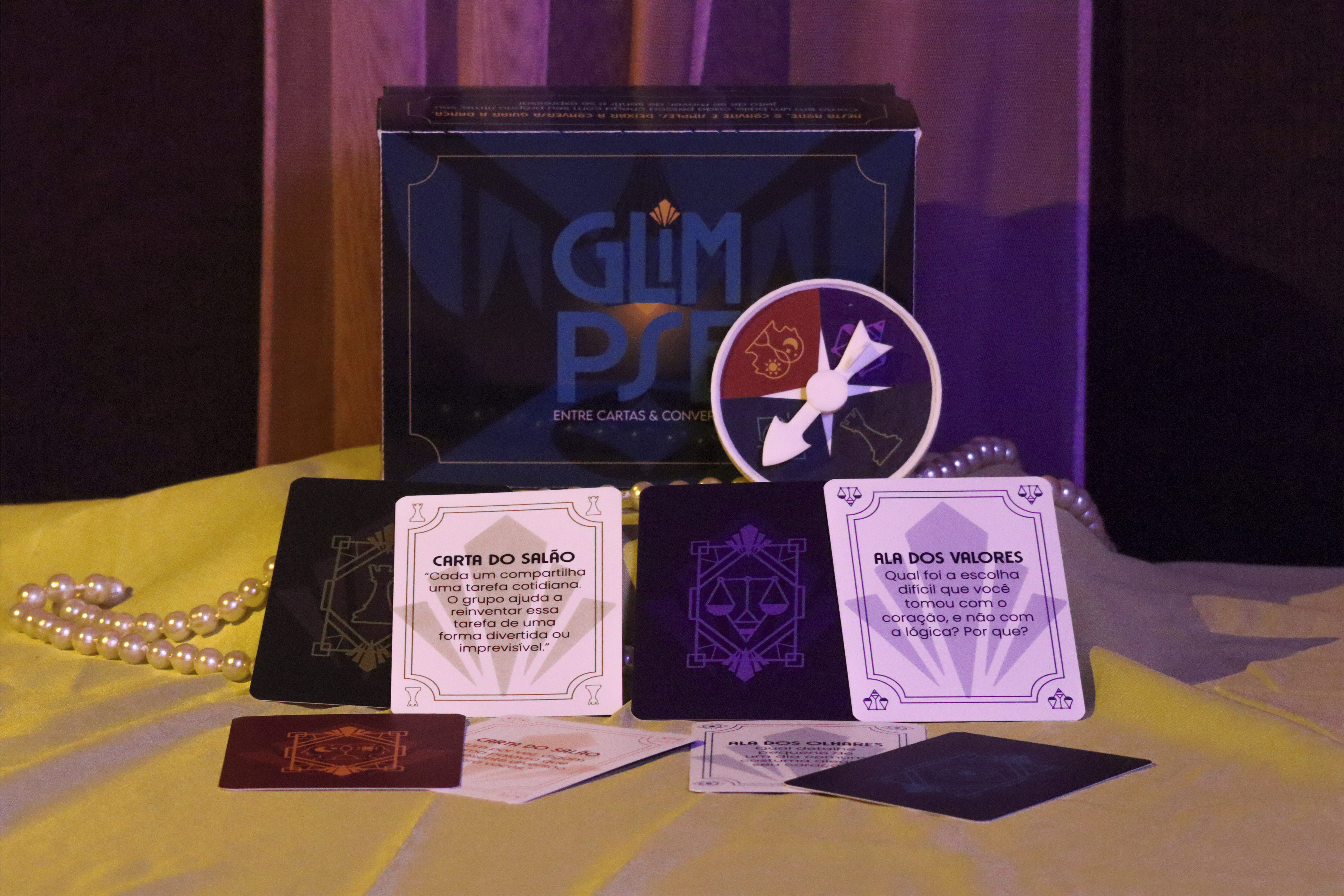 Votar neste projetoGlimpse é um jogo de cartas criado para gerar conexões reais, convidando os jogadores a mergulharem em conversas que revelam quem realmente são. Inspirado no modelo de perguntas do MBTI (Myers-Briggs Type Indicator), cada carta traz questões que despertam reflexão, empatia e compreensão das diferenças, tornando os encontros mais significativos. O diferencial está em unir ludicidade e autoconhecimento em um formato acessível, sem exigir conhecimento prévio da teoria. Sua estética é inspirada no glamour dos bailes e na elegância Art Déco, com grafismos geométricos e paleta sofisticada que tornam cada rodada memorável. Glimpse transforma diálogos em experiências marcantes, combinando design, psicologia e storytelling em um produto tão belo quanto significativo.