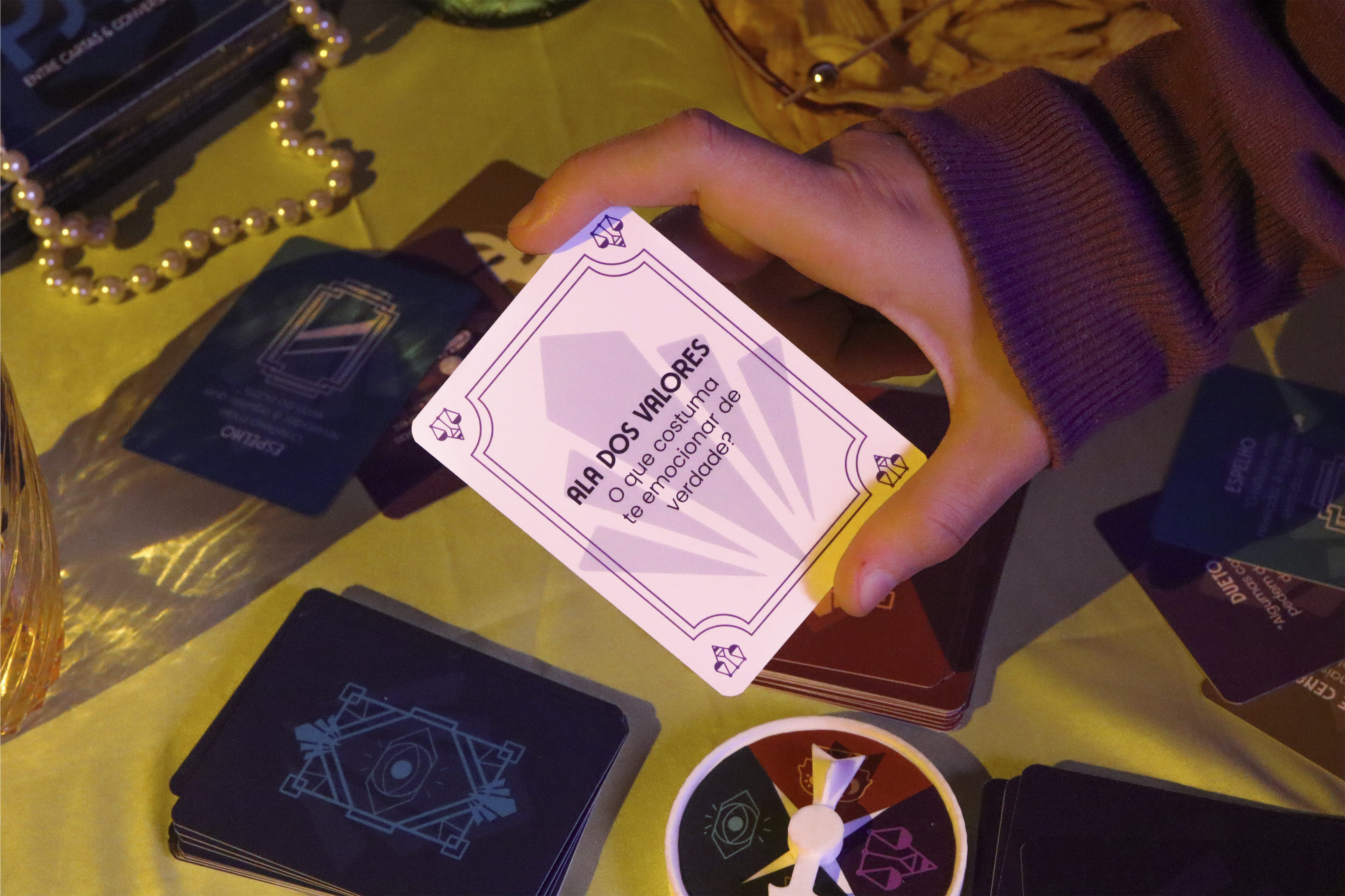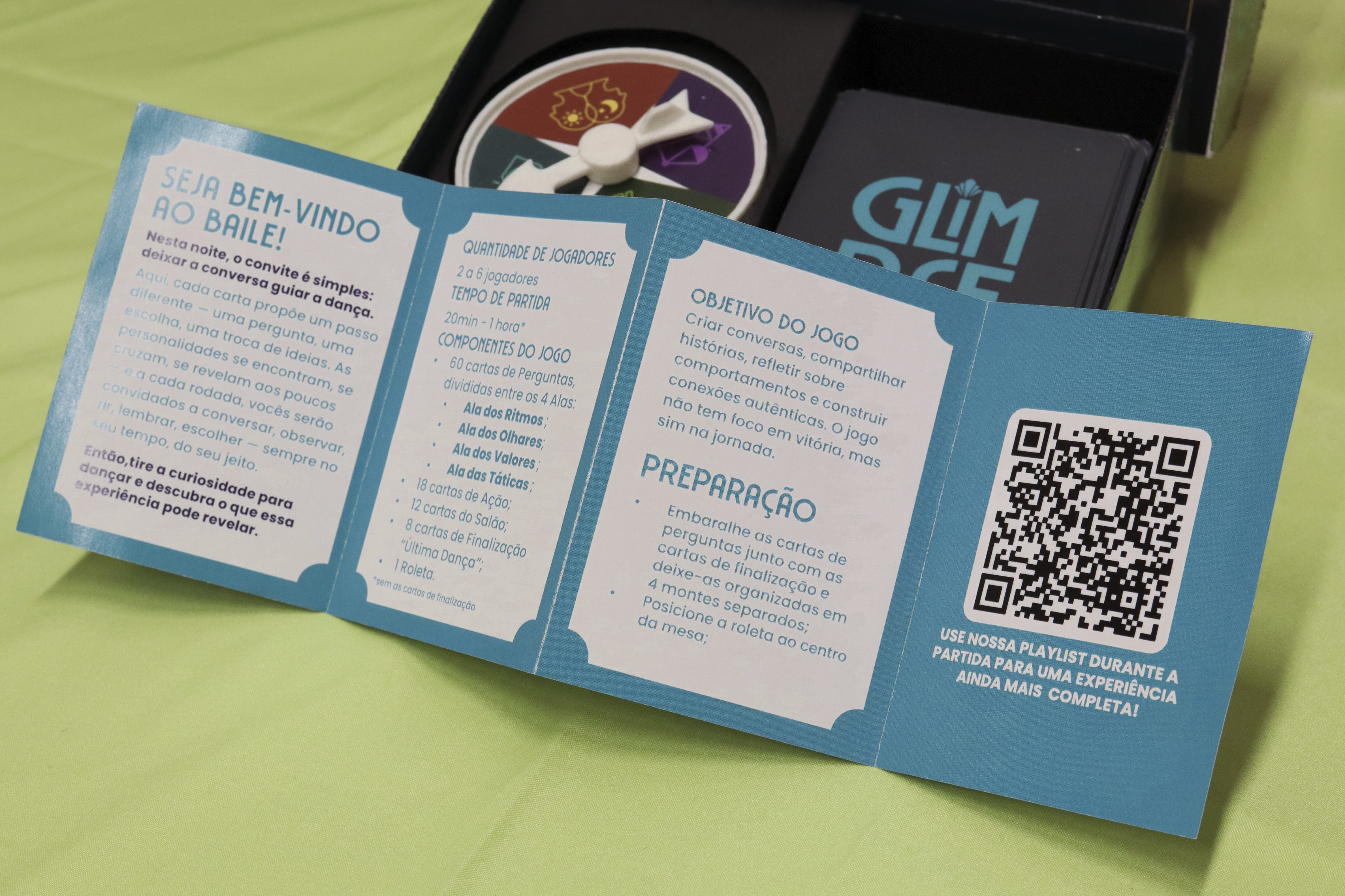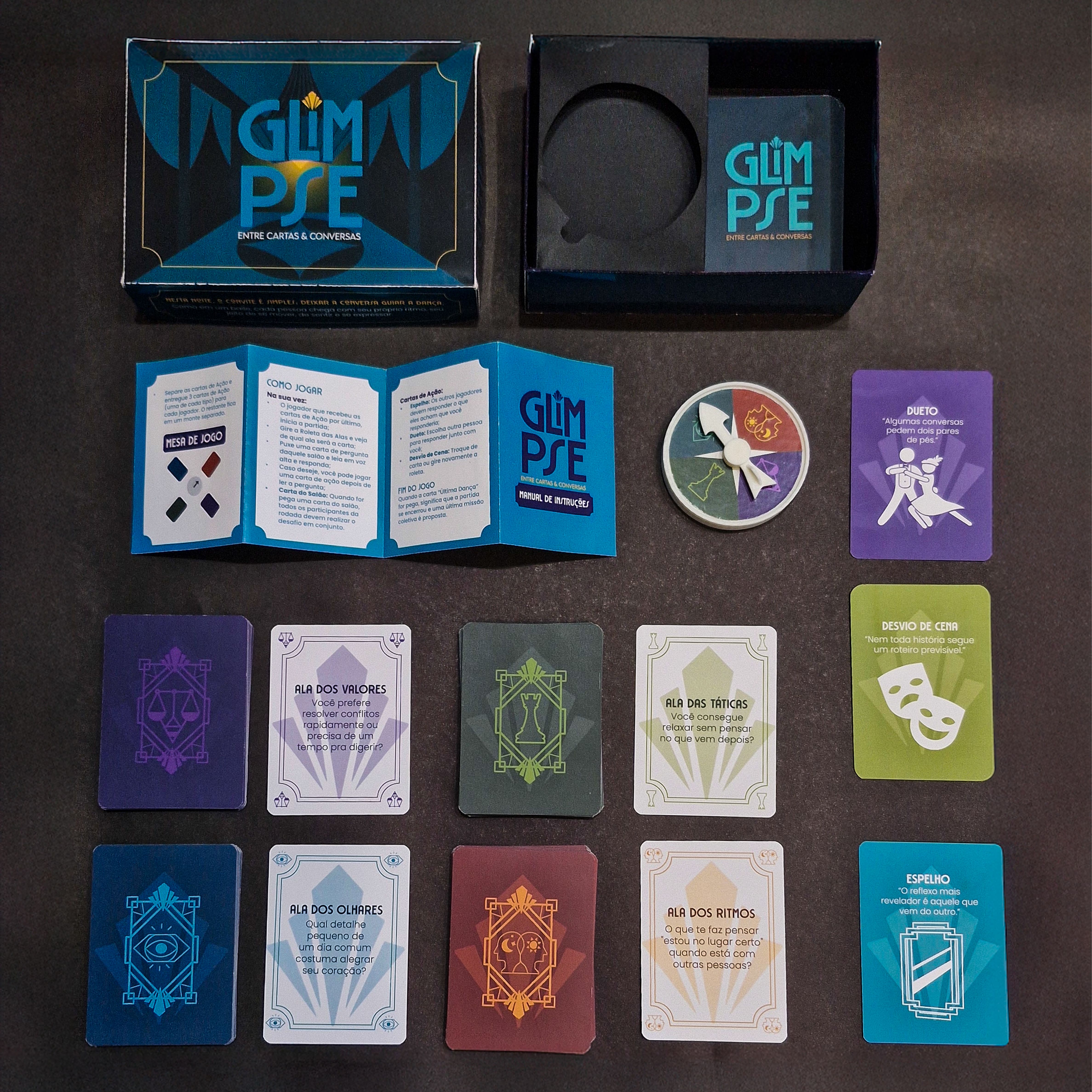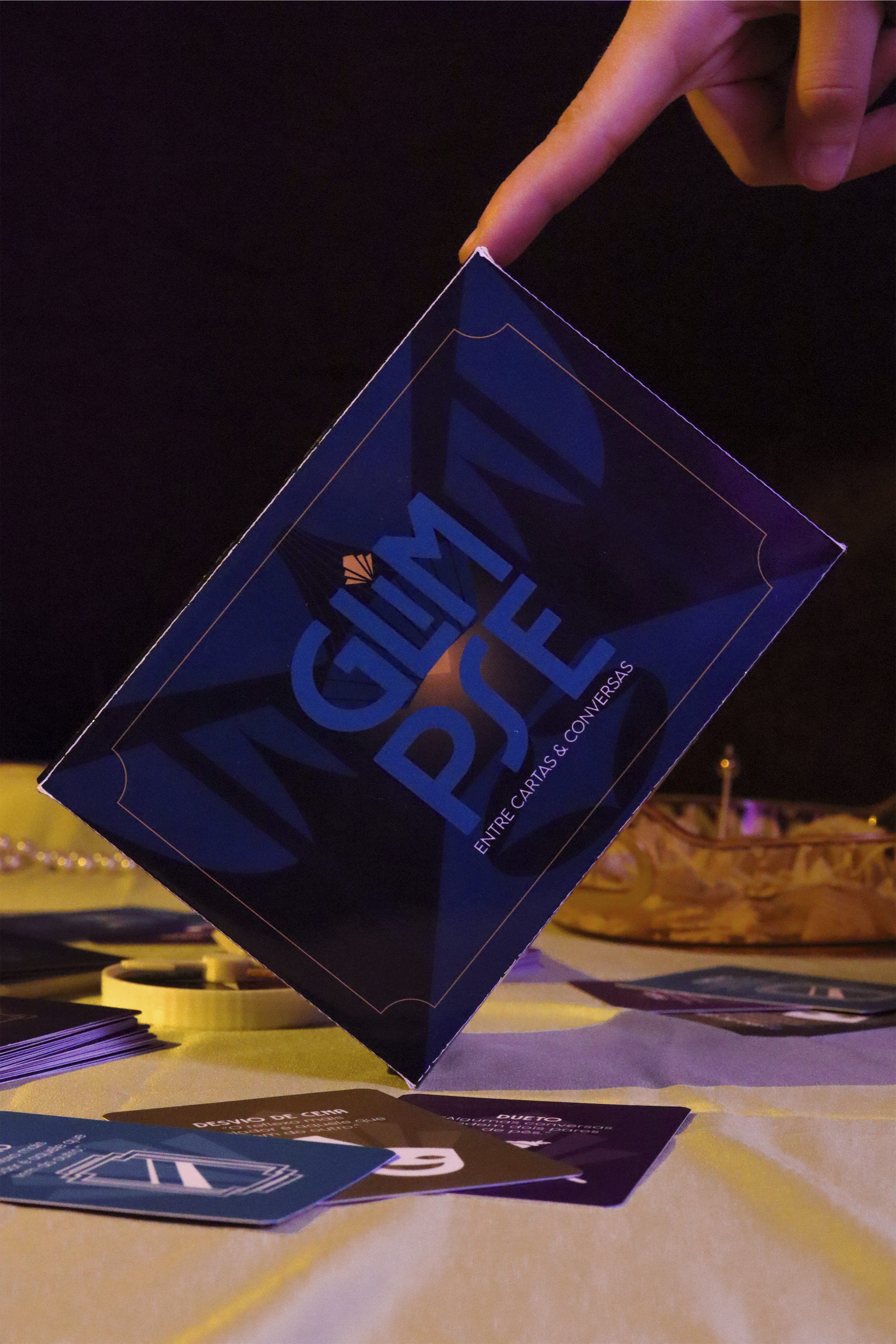 Votar neste projetoGlimpse é um jogo de cartas criado para gerar conexões reais, convidando os jogadores a mergulharem em conversas que revelam quem realmente são. Inspirado no modelo de perguntas do MBTI (Myers-Briggs Type Indicator), cada carta traz questões que despertam reflexão, empatia e compreensão das diferenças, tornando os encontros mais significativos. O diferencial está em unir ludicidade e autoconhecimento em um formato acessível, sem exigir conhecimento prévio da teoria. Sua estética é inspirada no glamour dos bailes e na elegância Art Déco, com grafismos geométricos e paleta sofisticada que tornam cada rodada memorável. Glimpse transforma diálogos em experiências marcantes, combinando design, psicologia e storytelling em um produto tão belo quanto significativo.